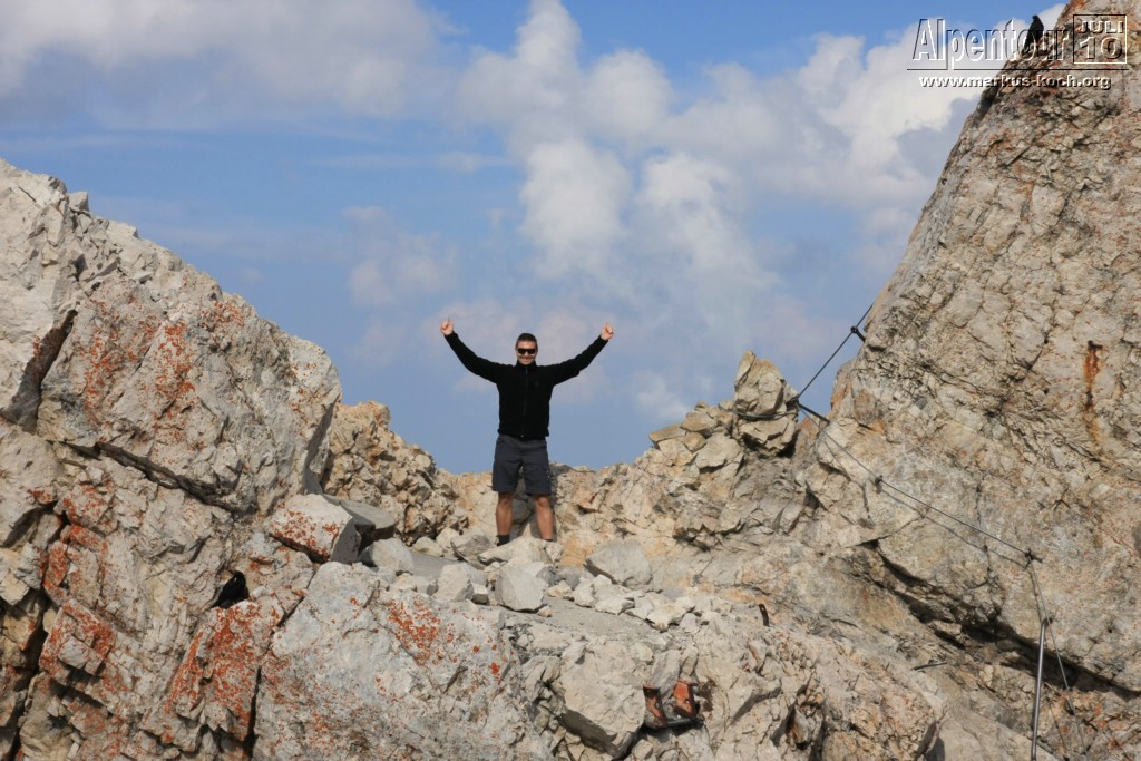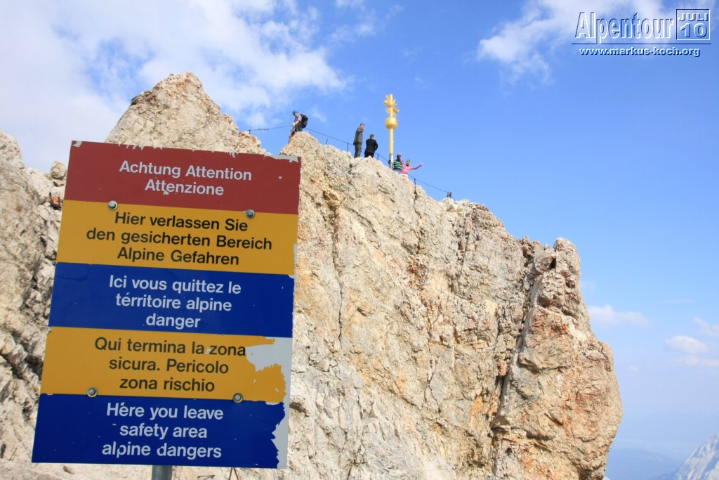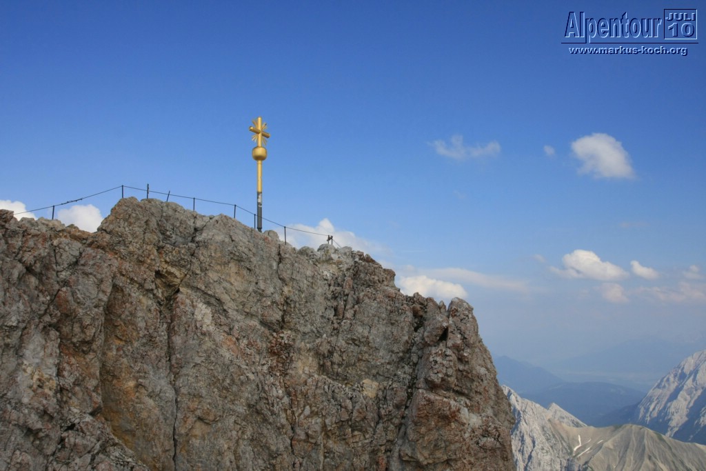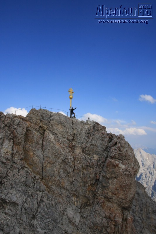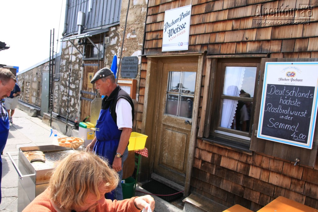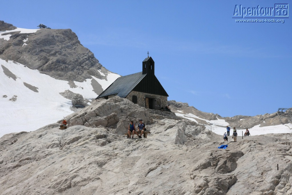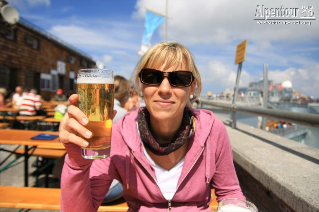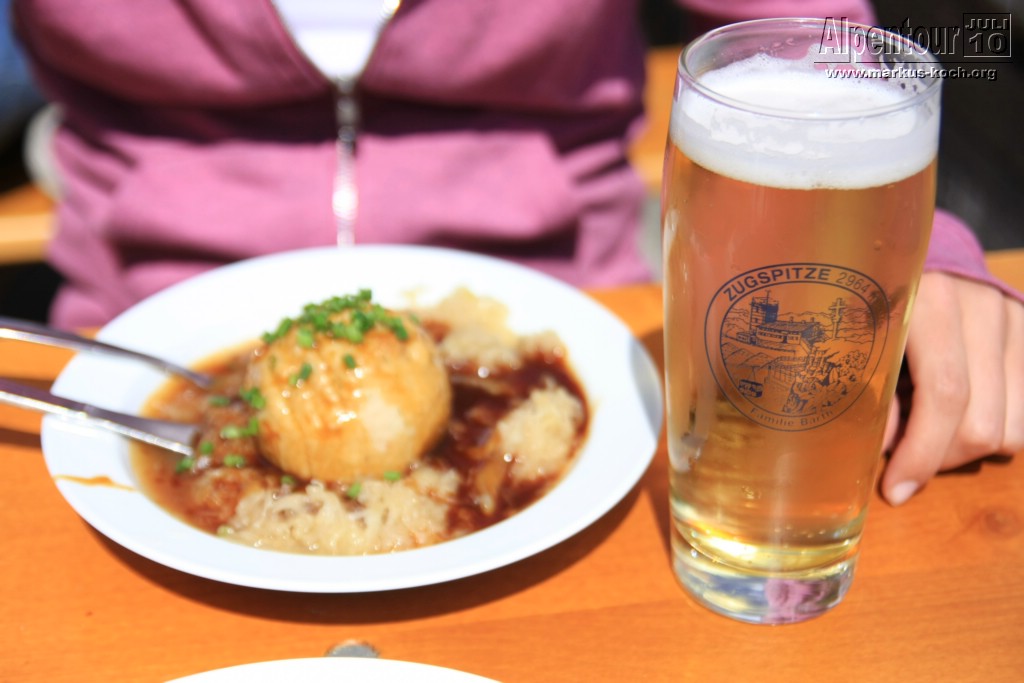 Nach kurzem Aufenthalt ging unser Fahrt nach Eibsee weiter. Vom Eibsee-Bahnhof fuhren wir mit der altbekannten Bayerischen Zugspitzbahn auf die Zugspitze bzw. zu SonnAlpin (2.600 m). Dort schauten wir uns Deutschlands höchste Kirche an und weiter gings mit der Seilbahn auf die Zugspitze (2.962 m). Auch dort kletterten wir zum Gipfelkreuz. Im höchsten Biergarten Deutschlands genossen wir bei Knödel mit Kraut und kühlem Radler den Ausblick und die warme Sonne.