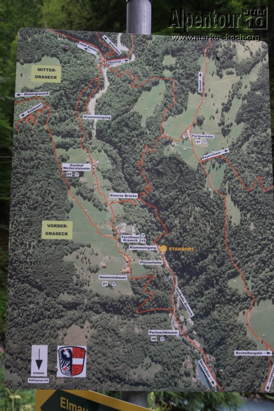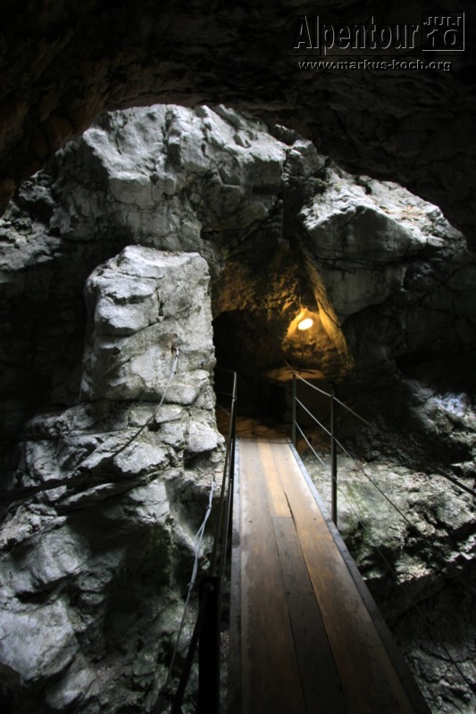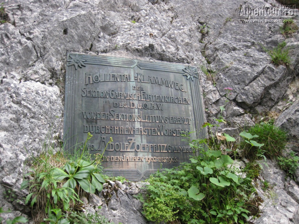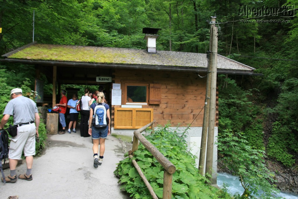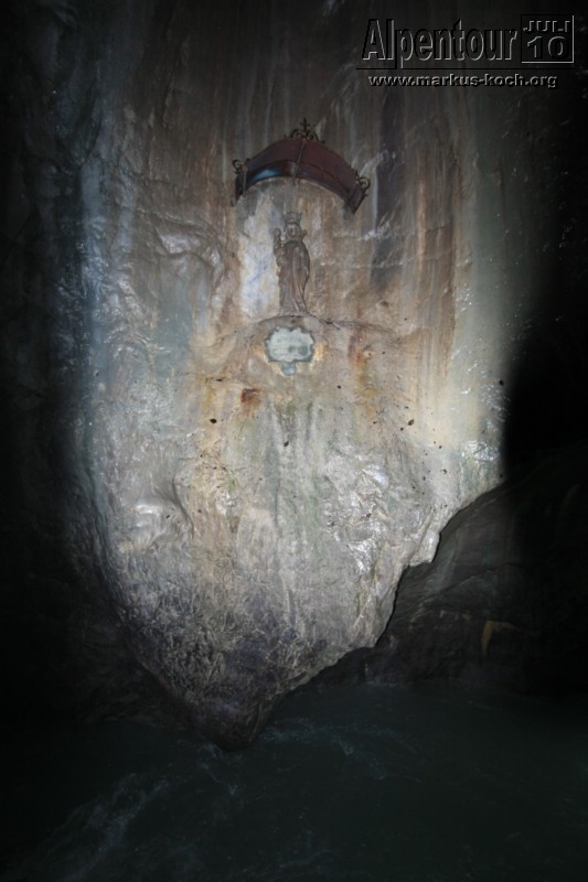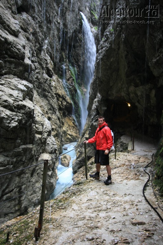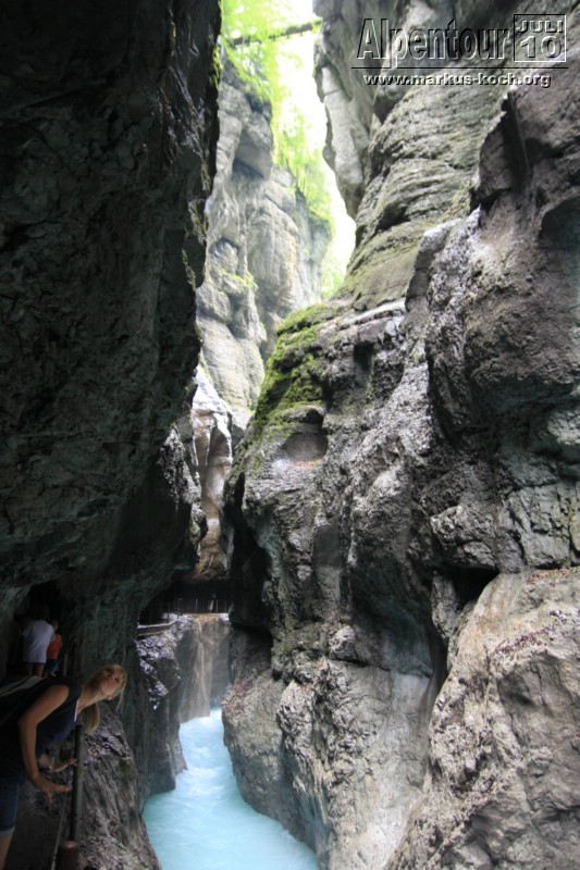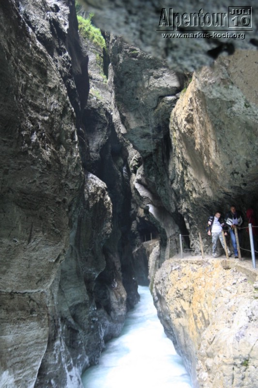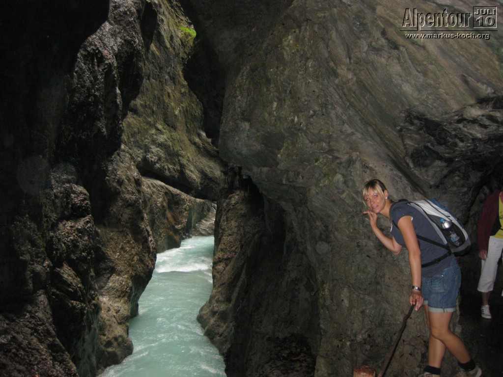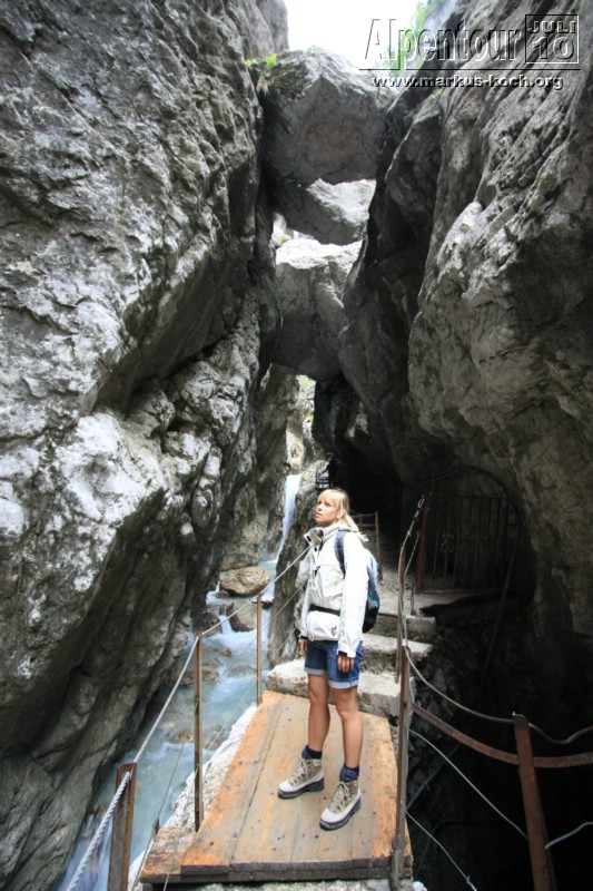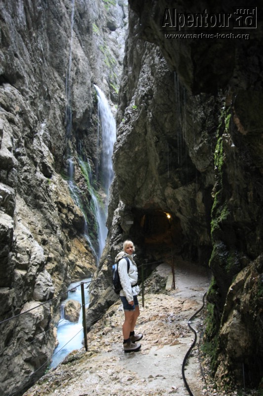 Nach einem 3 km Fußmarsch und 300 Höhenmeter höher erreichten wir die Höllentalklamm (ca. 150 m hohe Felsschluchten). Über gut 700 m erstreckt sich der Weg durch die imposante Klamm. Man hat hier unter großem Aufwand einen sicheren Weg geschaffen, der zu großen Teilen durch in den Fels geschlagene Tunnel von etwa 1 m Breite und maximal 2 m Höhe führt.