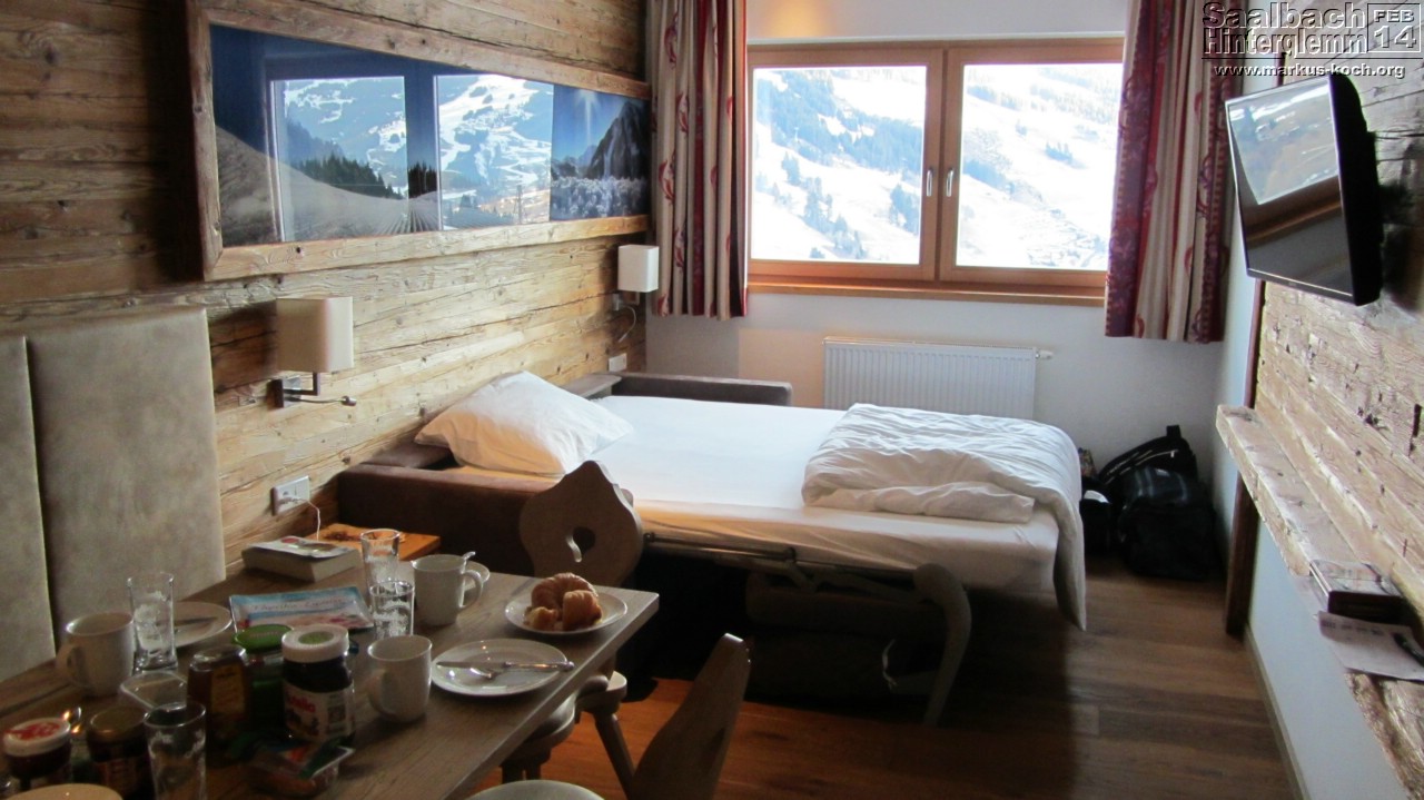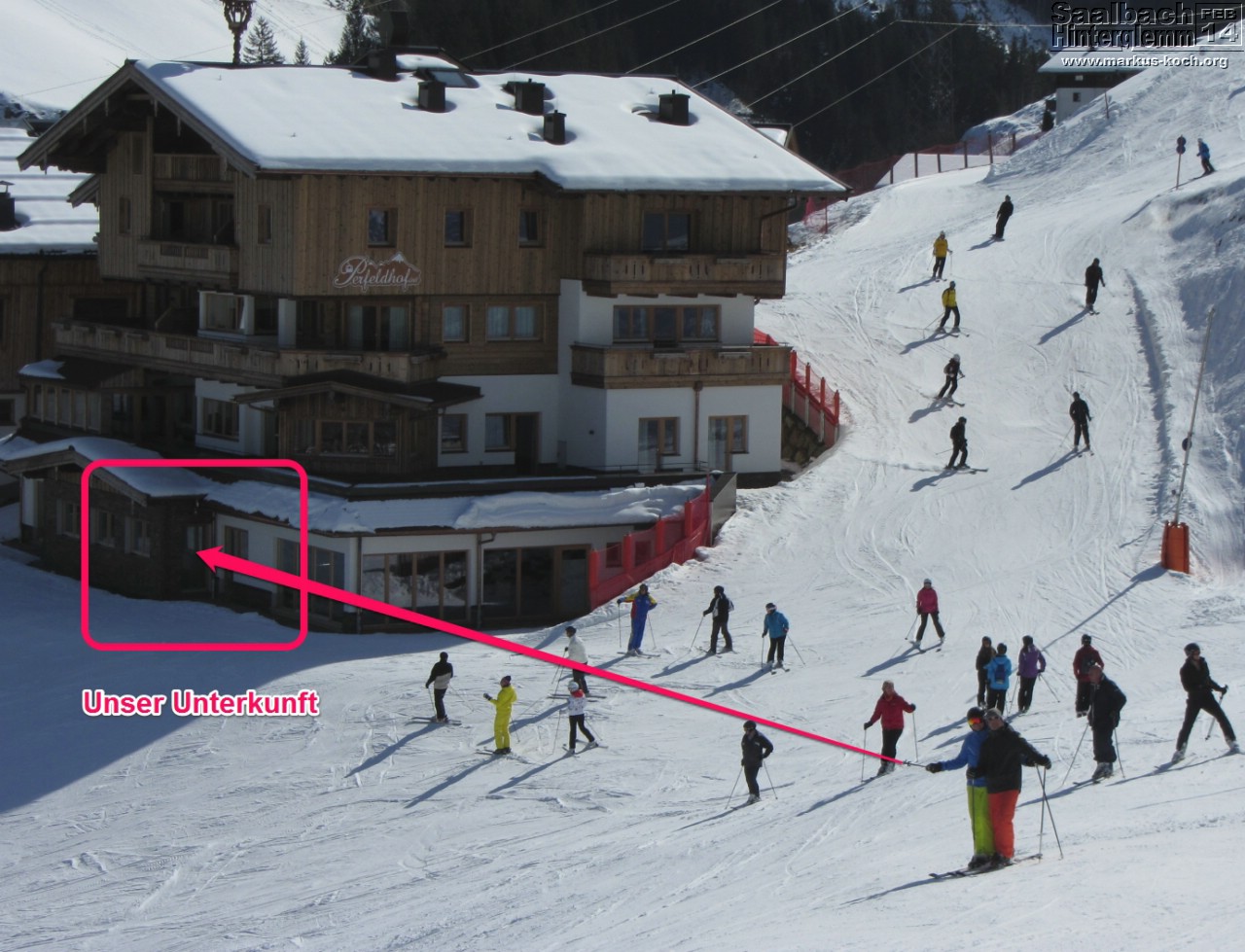 Unsere Unterkunft – der Perfeldhof –  war direkt an der Piste, oberhalb von Hinterglemm. Unser 3-Zimmer-Appartement war erst komplett saniert und dementsprechend neu und modern eingerichtet. Der einzigst kleine Nachteil war, dass die Unterkunft bei Schnee/Eis nur mit Schneeketten erreichbar ist.