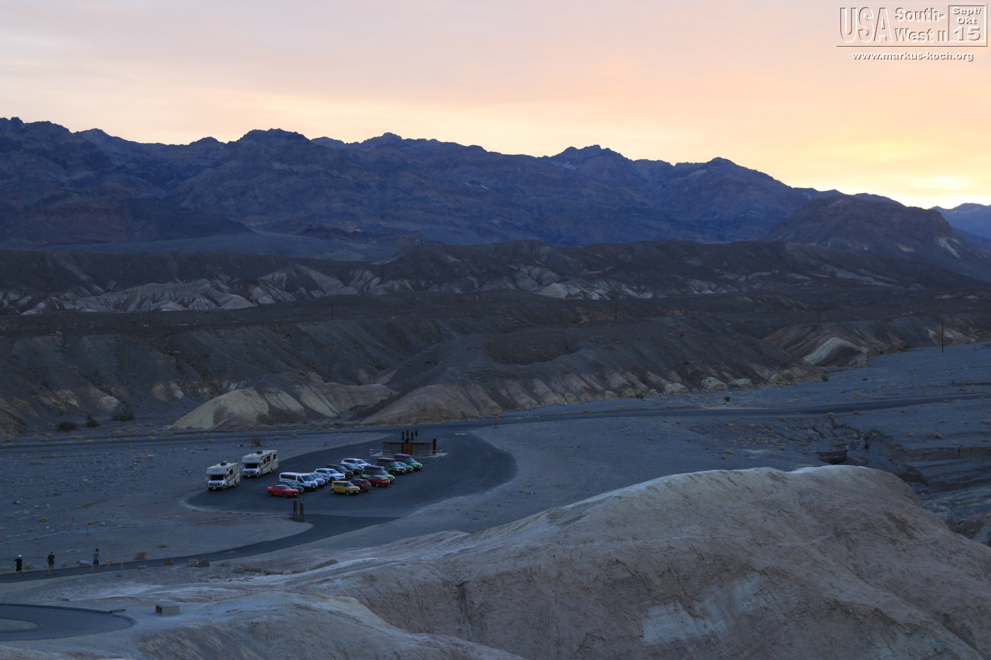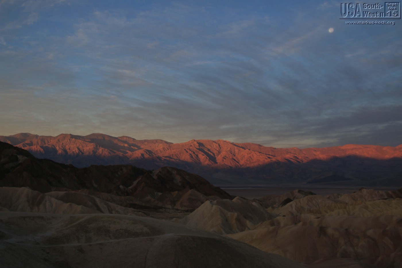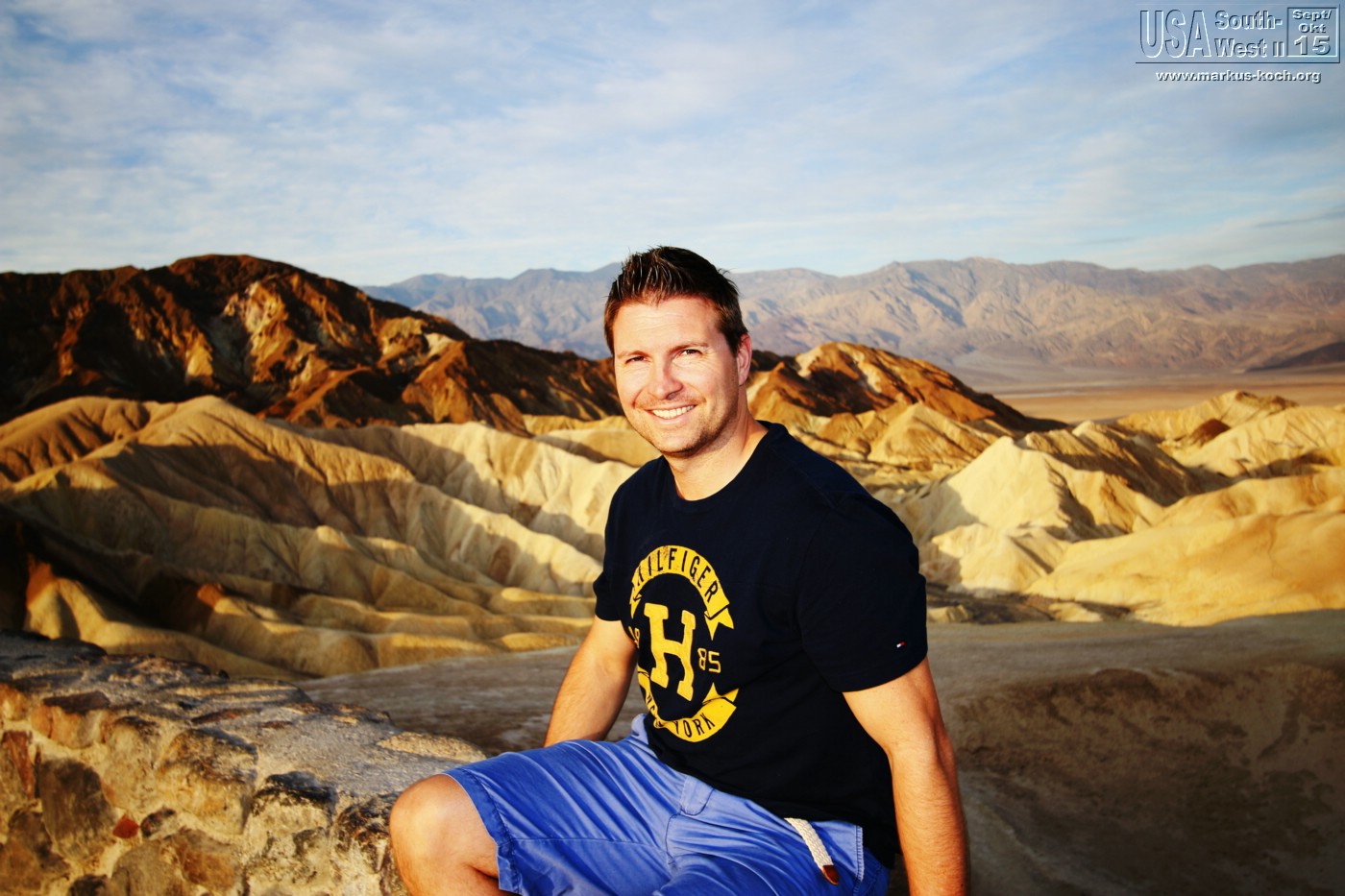 Frühststückshalt war an einem Aussichtspunktzum Sonnenaufgang im Death Valley: Zabriskie Point. Von hier sieht man ein Stück des Tals und des Golden Canyon, der mit der aufgehenden Sonne einfach toll aussieht!