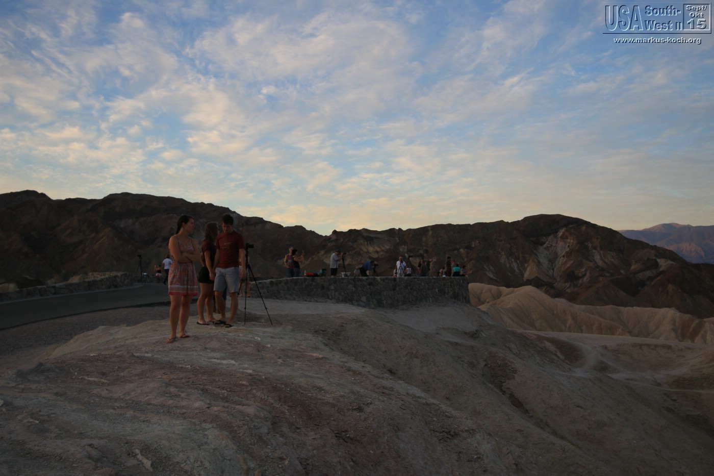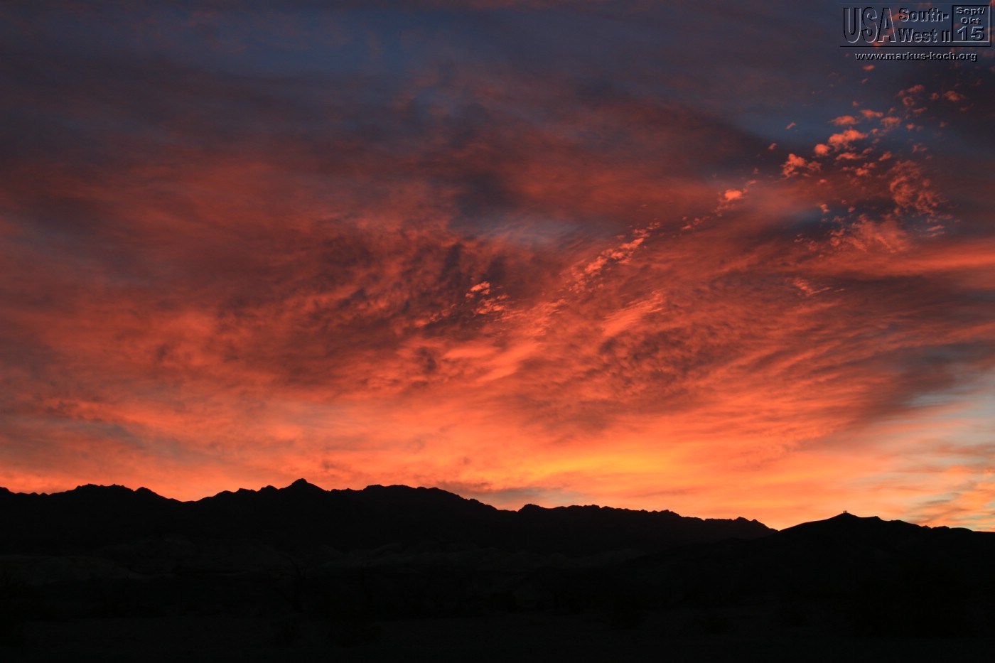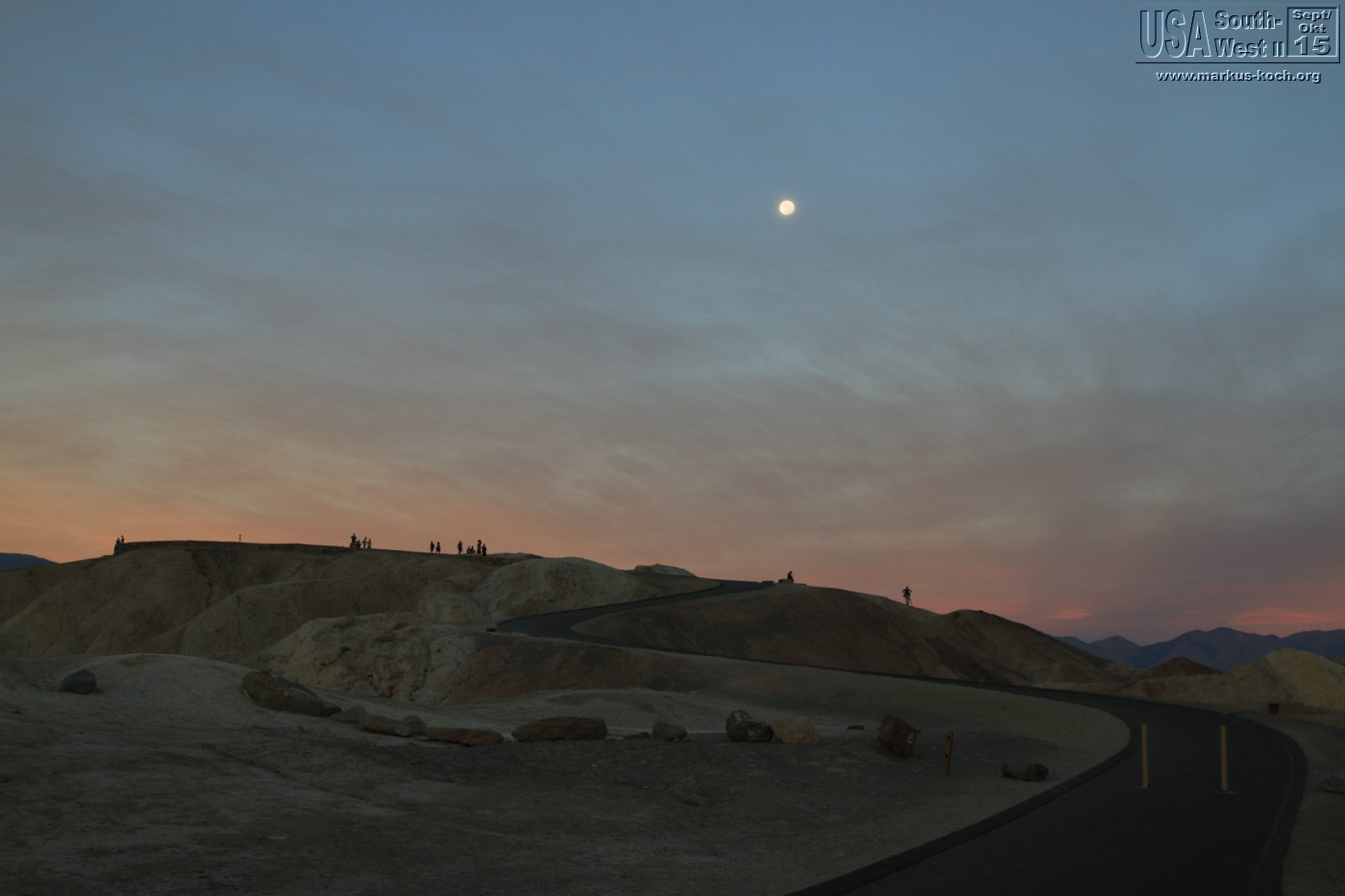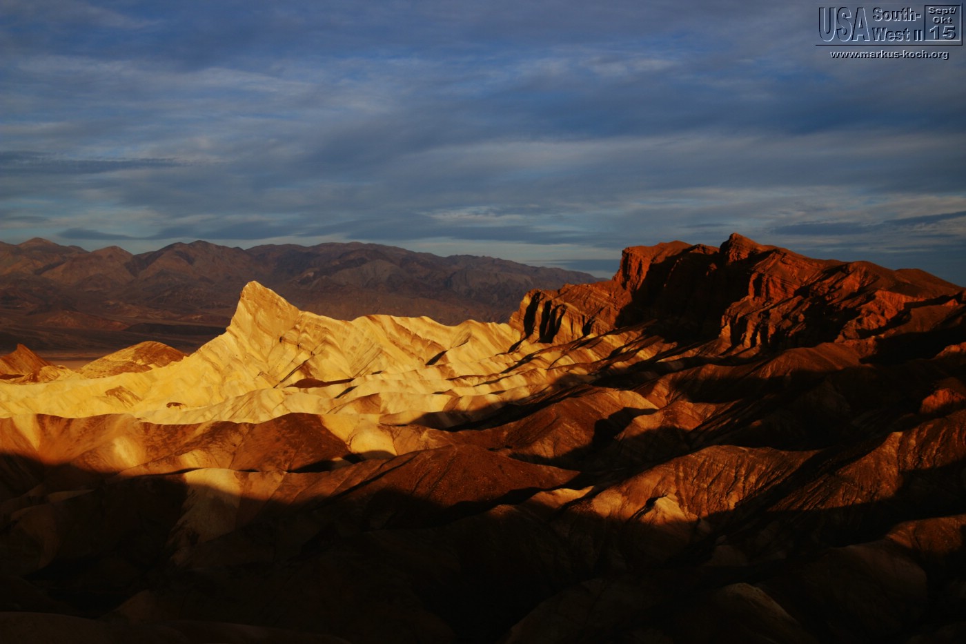 Frühststückshalt war an einem Aussichtspunktzum Sonnenaufgang im Death Valley: Zabriskie Point. Von hier sieht man ein Stück des Tals und des Golden Canyon, der mit der aufgehenden Sonne einfach toll aussieht!