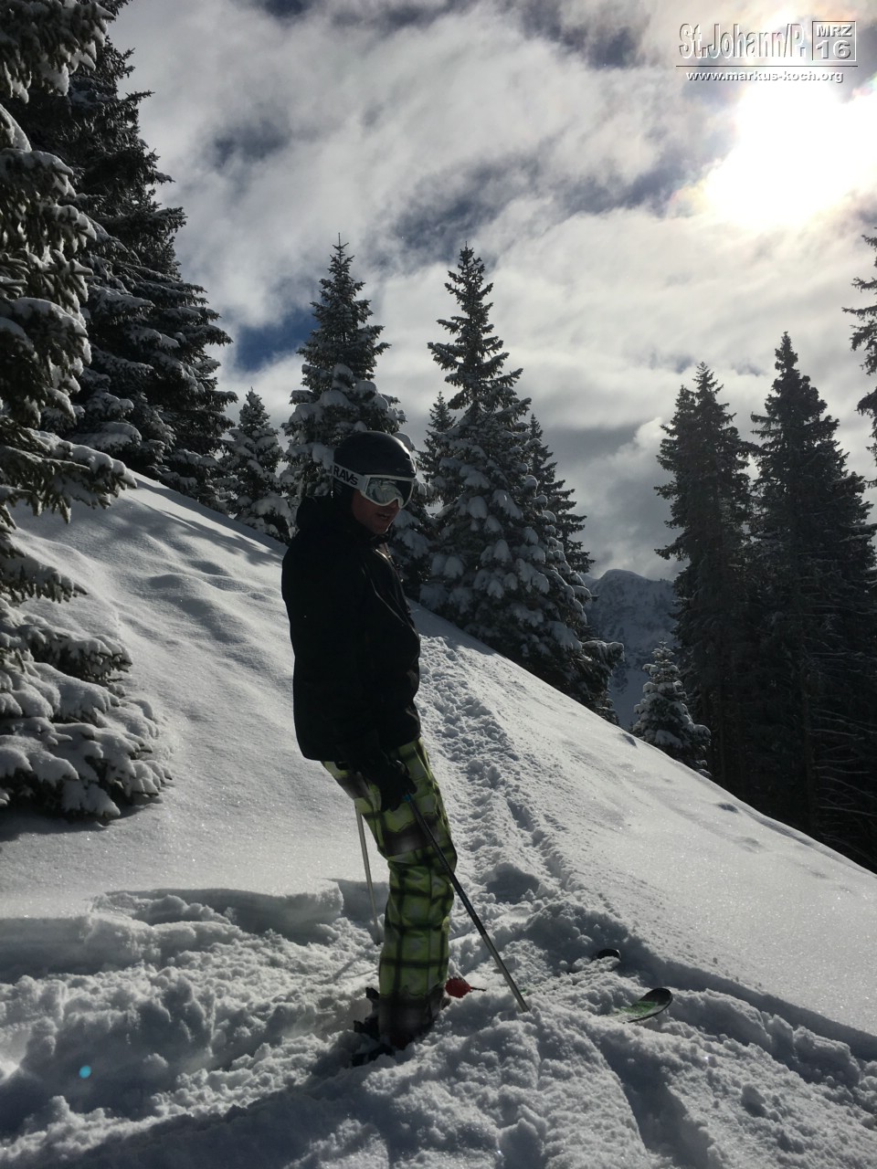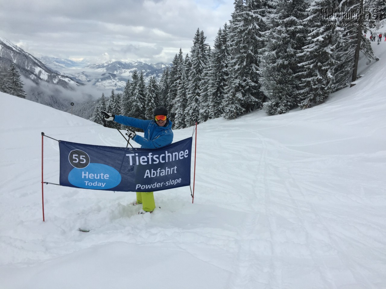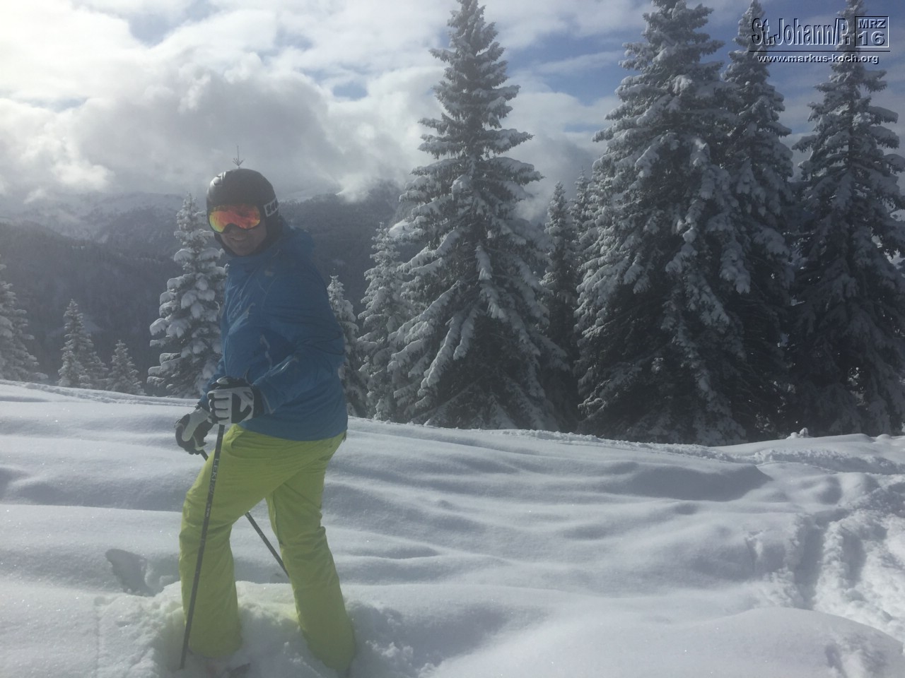 Nach leckerem Frühstück startete der Tag an unserem Hausberg im Alpendorf (5 min mit dem Skibus direkt vom Hotel). Am Gipfel angekommen erwartete uns ein toller Neuschnee. Mit 35 cm Powder fanden wir zufälliger Weise eine nicht präparierte Tiefschneepiste, wo es auch noch links und rechts, teileweise sogar im Wald, hinaus ging. Ganz toll dort, es machte tierisch Spaß!!!!