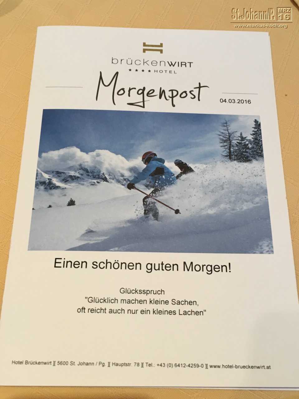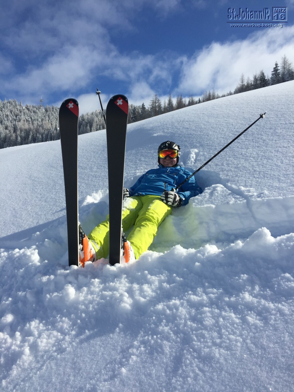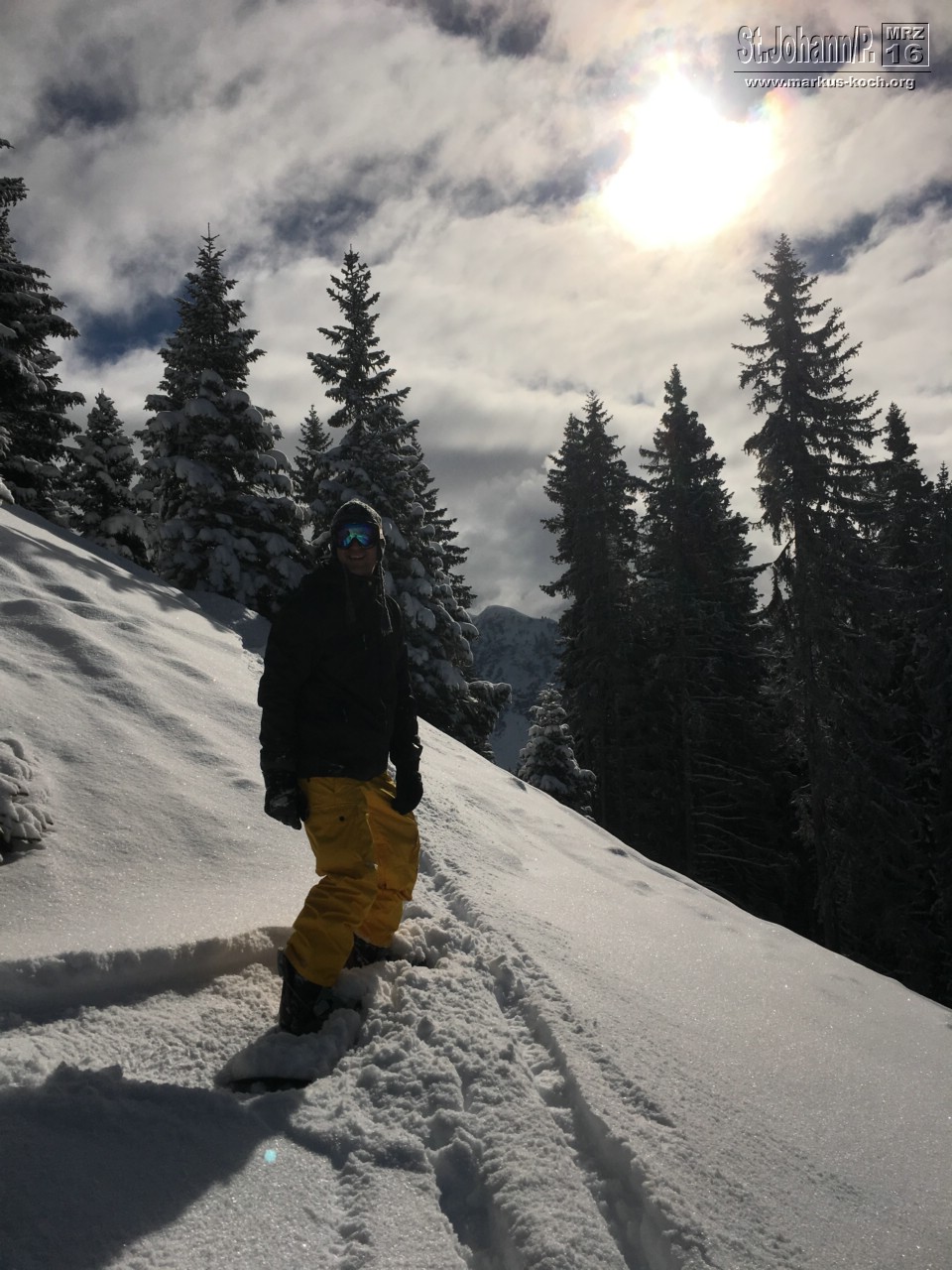 Nach leckerem Frühstück startete der Tag an unserem Hausberg im Alpendorf (5 min mit dem Skibus direkt vom Hotel). Am Gipfel angekommen erwartete uns ein toller Neuschnee. Mit 35 cm Powder fanden wir zufälliger Weise eine nicht präparierte Tiefschneepiste, wo es auch noch links und rechts, teileweise sogar im Wald, hinaus ging. Ganz toll dort, es machte tierisch Spaß!!!!
