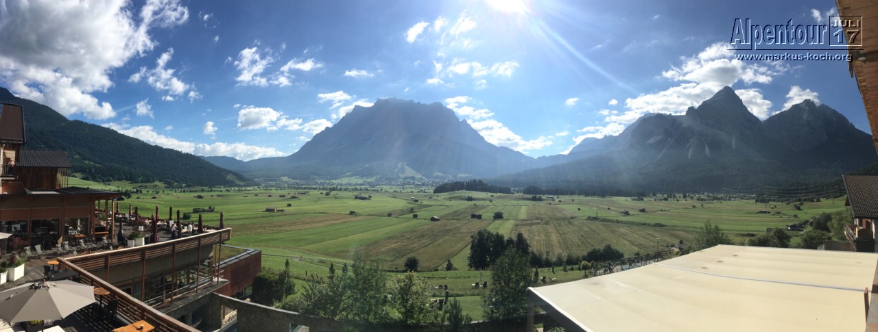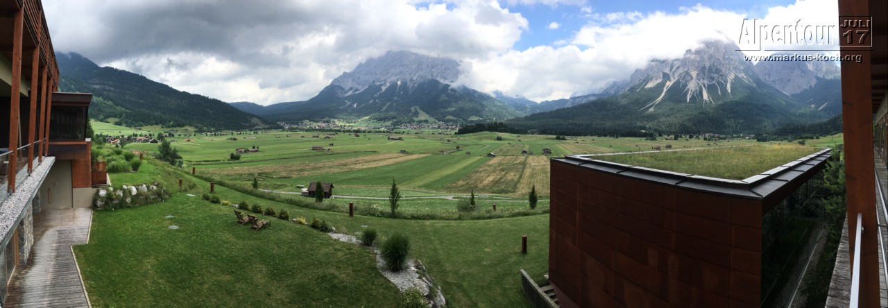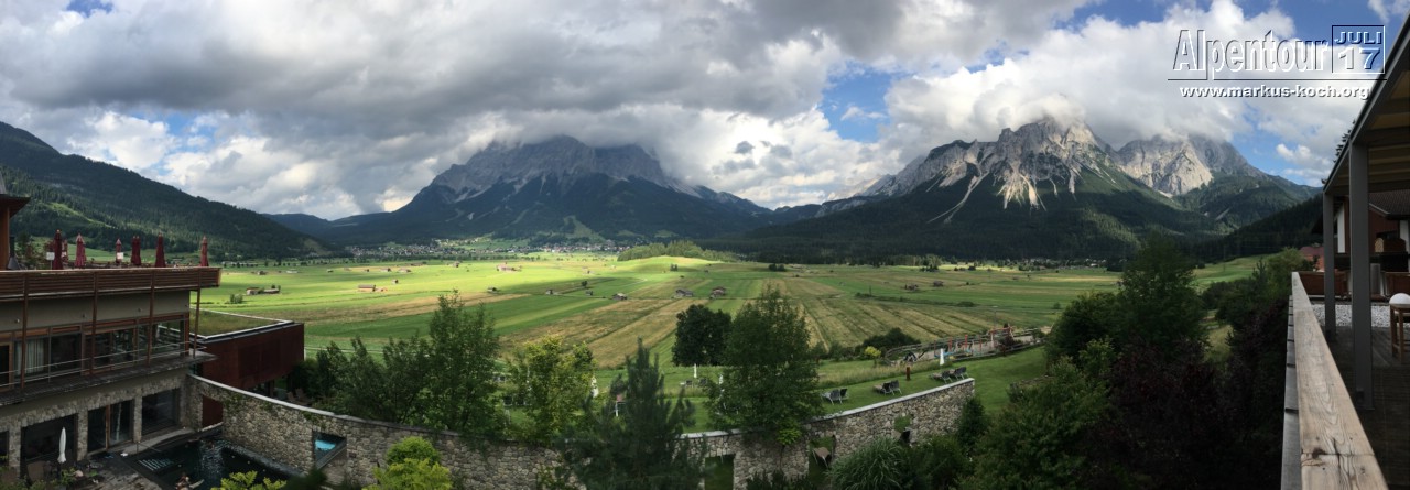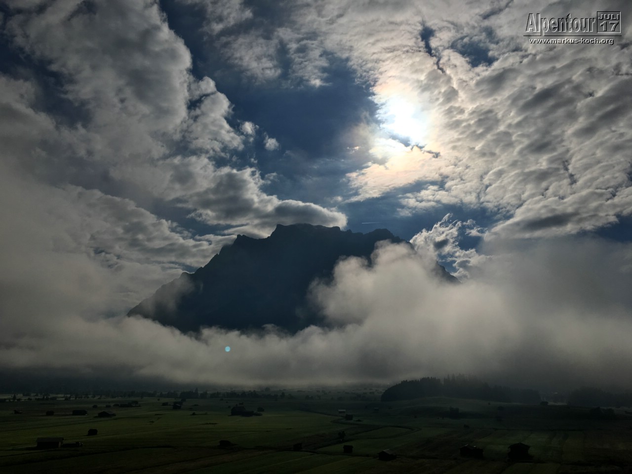 Noch im Nebel verhüllt war die Zugspitze, als wir aufwachten. Bis nach dem Frühstück war Deutschlands höchster Gipfel dann komplett sichtbar. Ein sehr schöner Anblick von der österreichischen Seite!