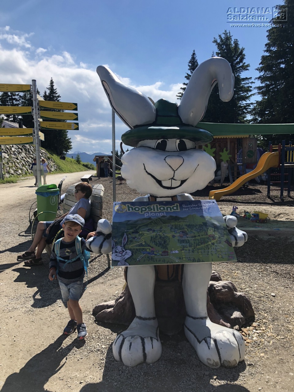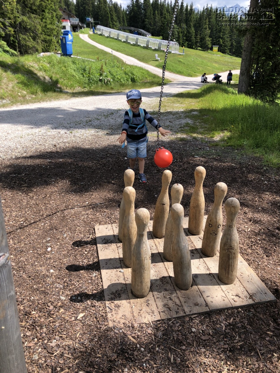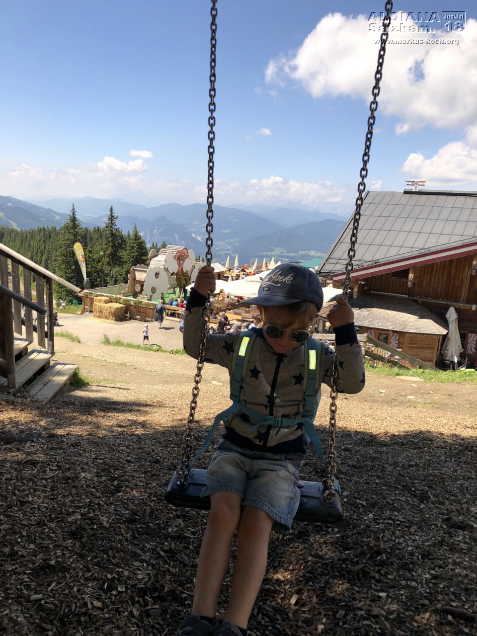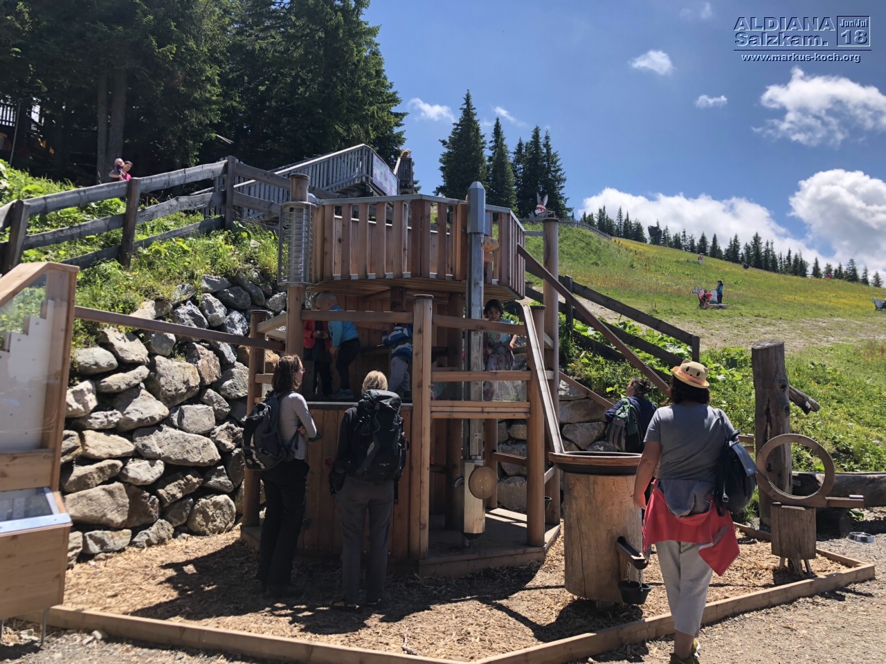 Schladminger Planai | Hopsiland – Schließlich erreichten wir Schladming. Mit der Gondel ging es hinauf ins Hopsiland. Ein Rundweg von ca. 40 Minuten, der bei uns aber 3 h dauerte. Klar, es gab auf dem Rundweg jede Menge zu spielen…. Kugelbahnen, Rutschen, Holz-Pistenraube, Wasserbahnen, Trampolin uvm.