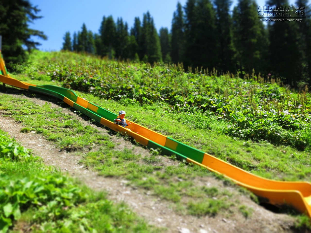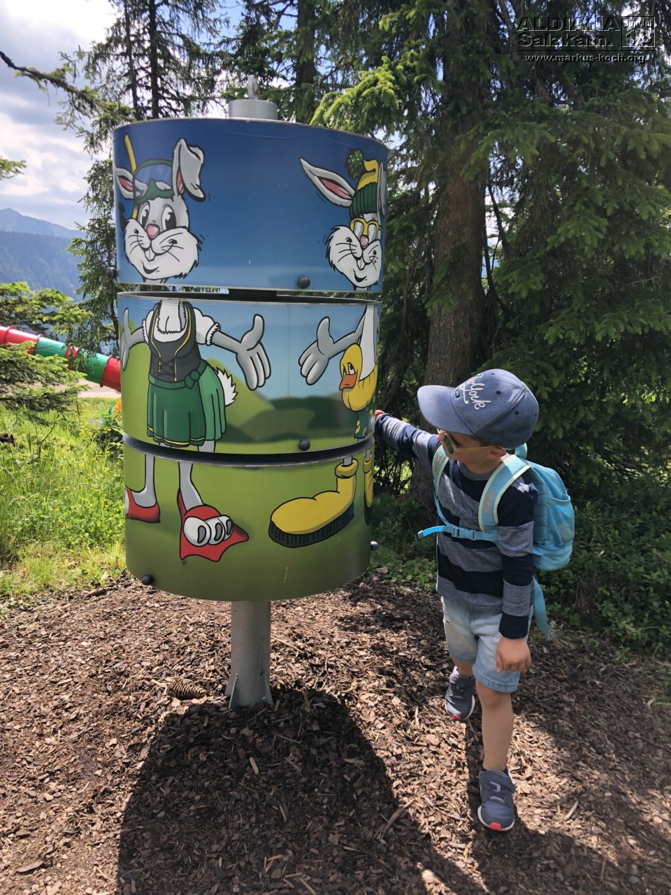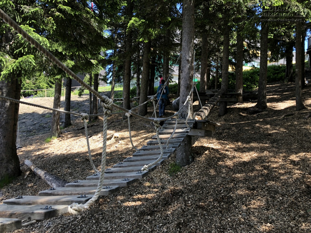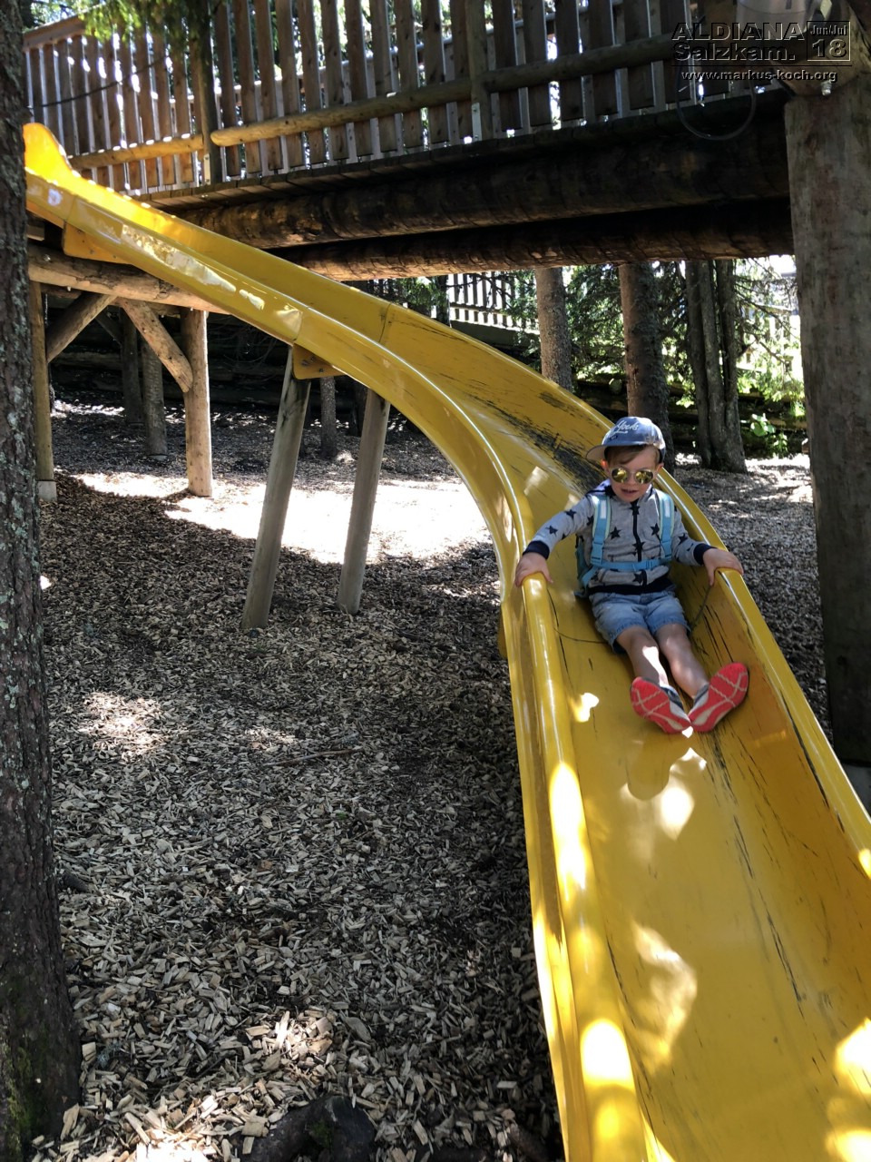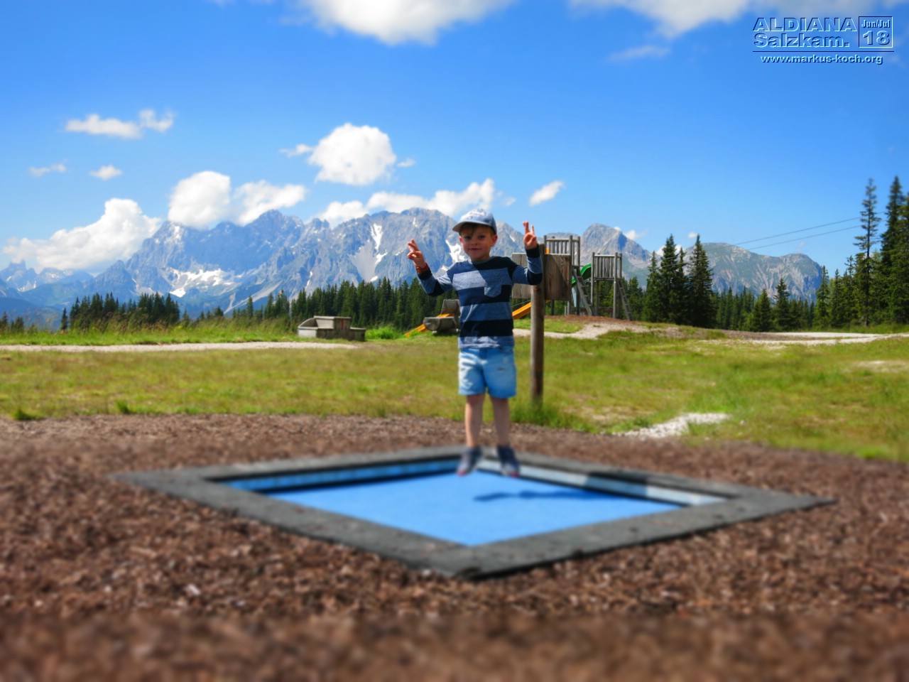 Schladminger Planai | Hopsiland – Schließlich erreichten wir Schladming. Mit der Gondel ging es hinauf ins Hopsiland. Ein Rundweg von ca. 40 Minuten, der bei uns aber 3 h dauerte. Klar, es gab auf dem Rundweg jede Menge zu spielen…. Kugelbahnen, Rutschen, Holz-Pistenraube, Wasserbahnen, Trampolin uvm.