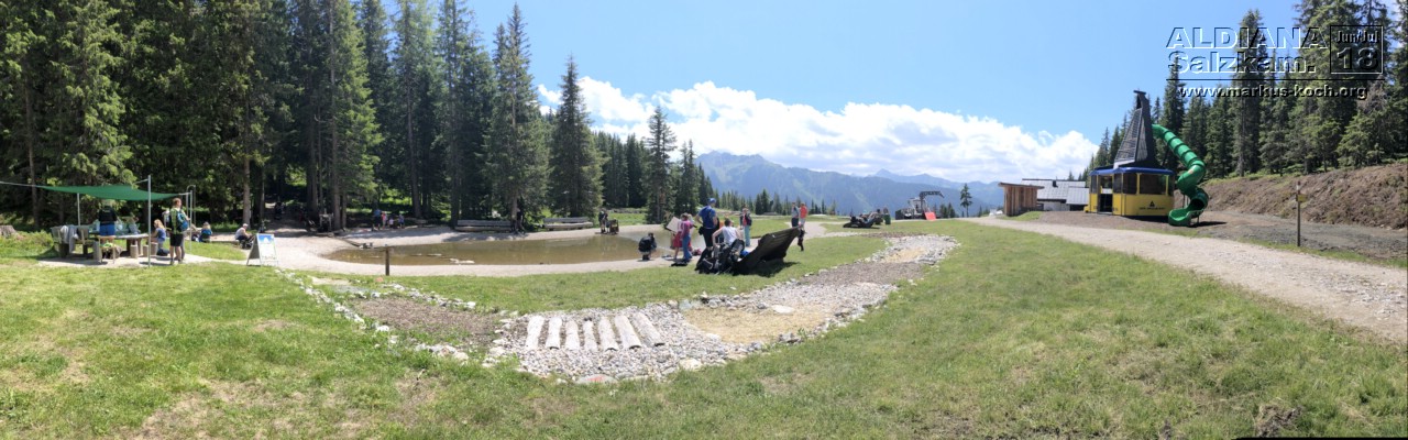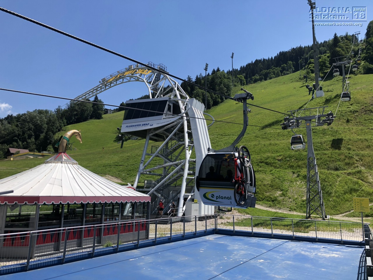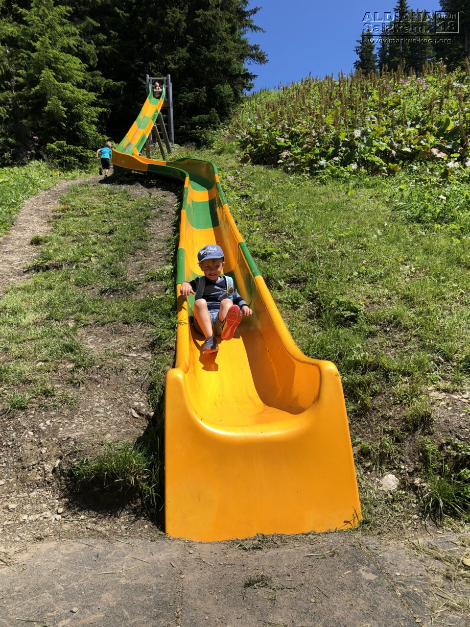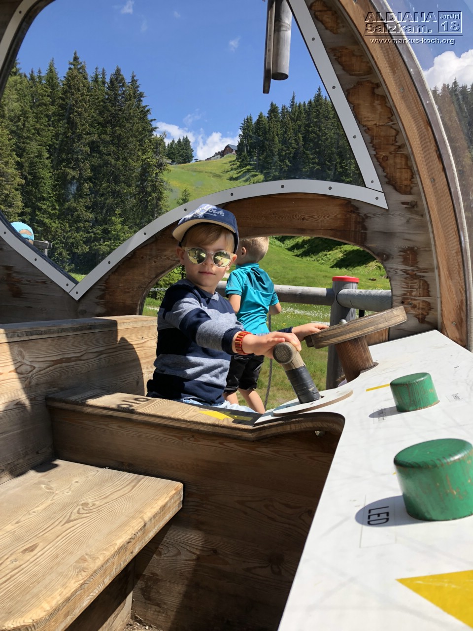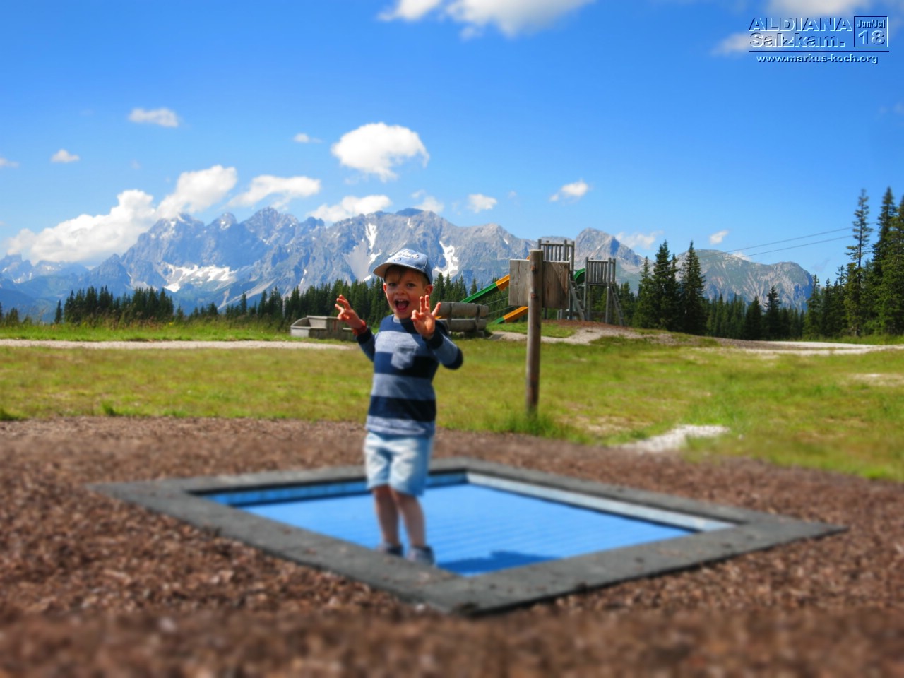 Schladminger Planai | Hopsiland – Schließlich erreichten wir Schladming. Mit der Gondel ging es hinauf ins Hopsiland. Ein Rundweg von ca. 40 Minuten, der bei uns aber 3 h dauerte. Klar, es gab auf dem Rundweg jede Menge zu spielen…. Kugelbahnen, Rutschen, Holz-Pistenraube, Wasserbahnen, Trampolin uvm.