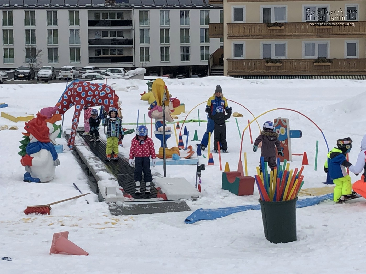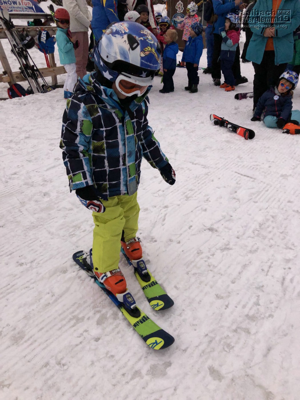 Heute brachten wir alle gemeinsam Luca zum Skikurs. Es war ein besonderer Tag für ihn, da es zum Tellerlift ging. Mit der Snowly-Skidoo-Eisenbahn wurden die Kids zum richtigen Anfängerhügel in der Nähe gefahren.