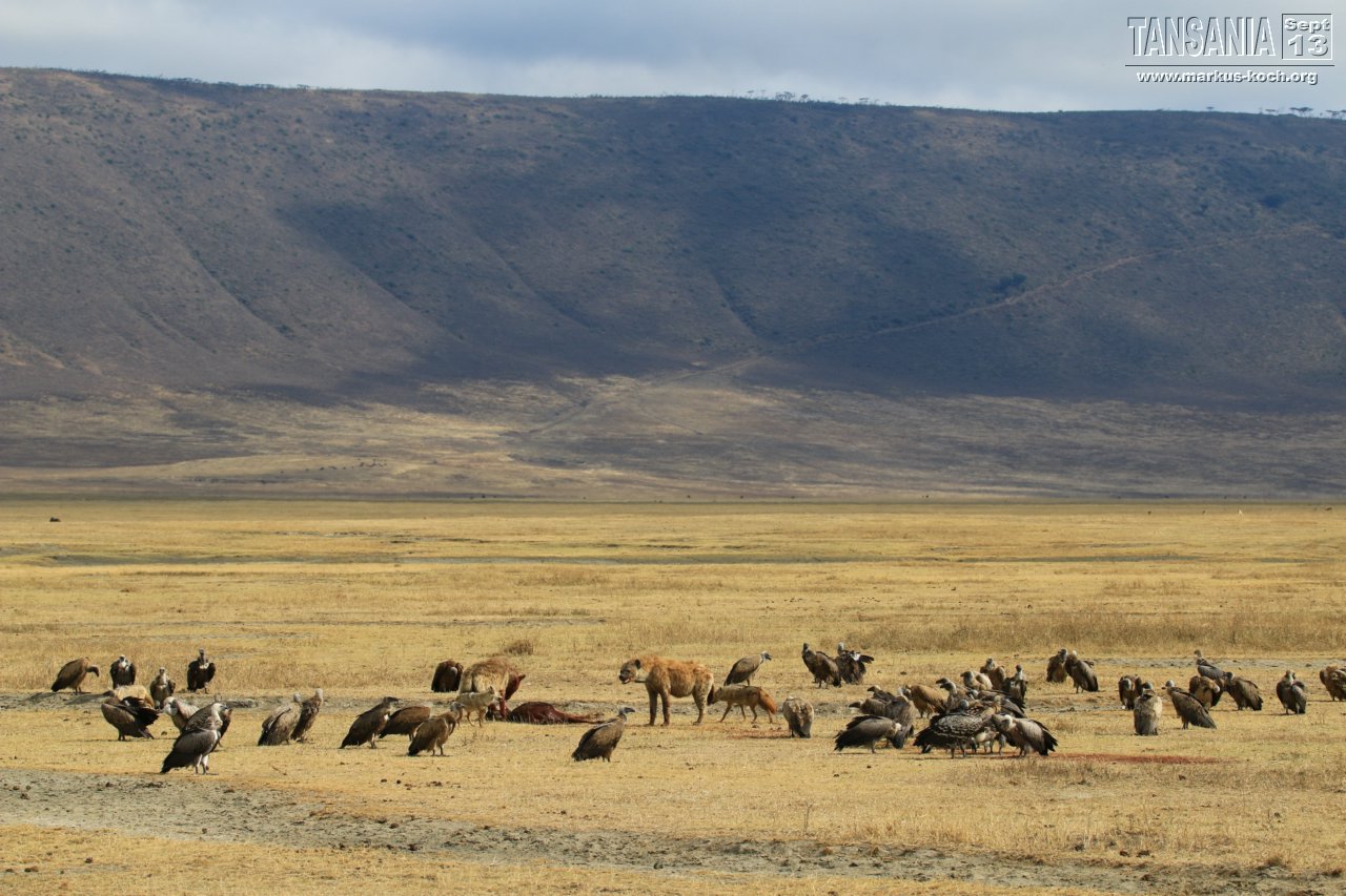 Ausnahmsweise holte uns Emanuel schon um 7 Uhr ab, damit wir zeitig im Ngorongoro Krater mit der vorletzen Safarifahrt starten konnten. Der Krater umfasst 300 qkm und hat auch eine ganz schöne Weite. Interessant ist, dass man eigentlich alles sehen kann, aber dennoch weit weg ist. Auch dort waren wieder etliche Tiere unterwegs: Büffel, Affen, Warzenschweine, Löwen – 2 Löwen waren heute wieder in Romantic und danach lagen sie direkt an unserem Auto – bei den Bildern ganz hinten!, Zebras, Gnus, Nilpferde, Gazellen, Fressende Hyänen, Schakale und Geier die den Rest davon bekommen, Strauße, Nashörner (leider nur aus der Ferne, aber: WE GOT IT!!!! THE BIG FIVE!)