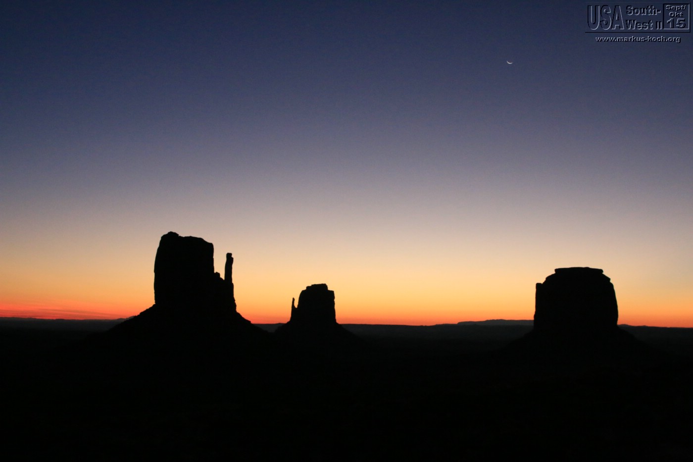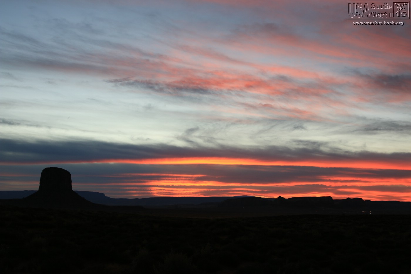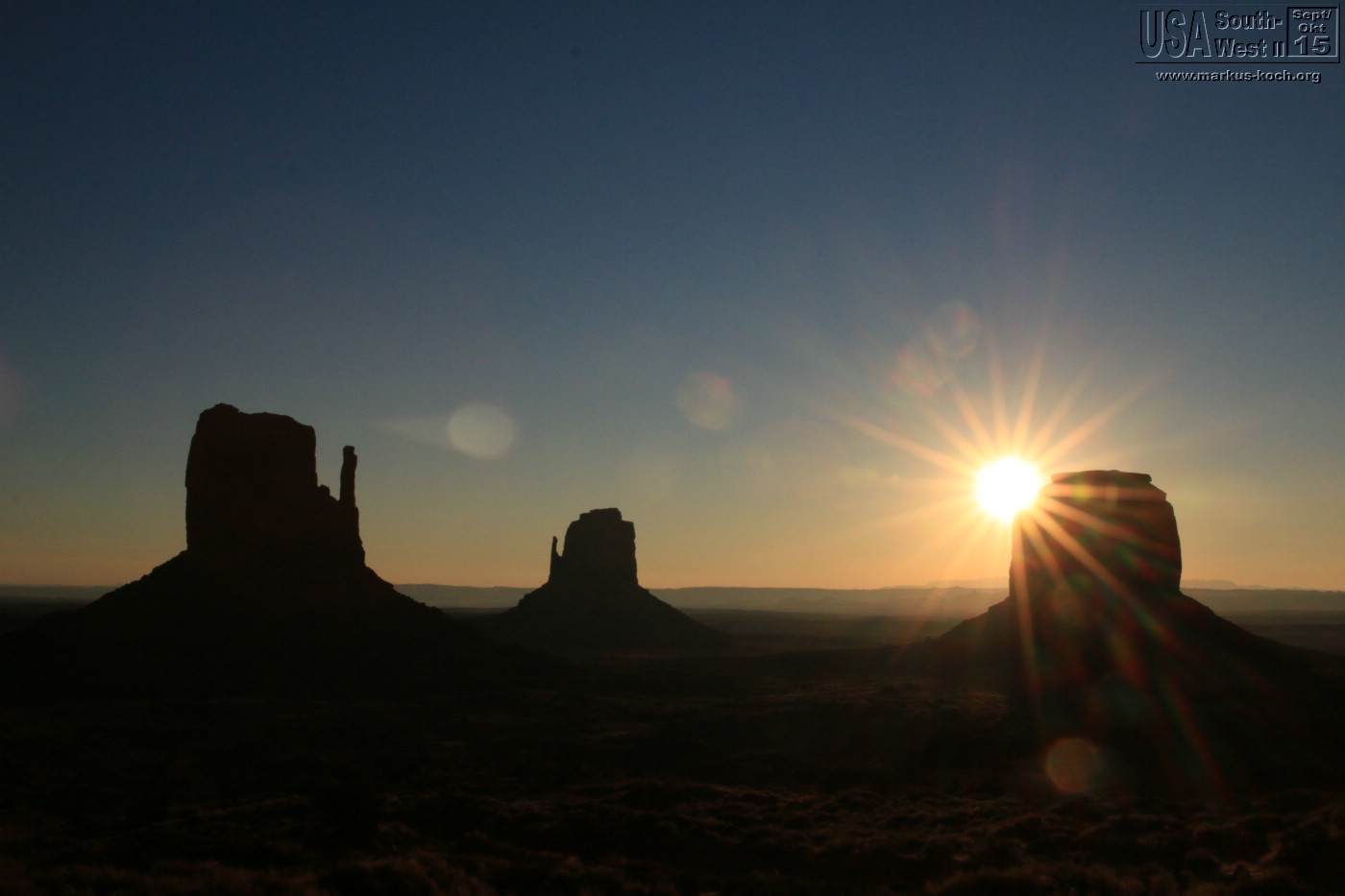 Ich stand pünktlich zum Sonnenaufgang auf, um ihn direkt vor den bekannten Buttes auf Bildern festzuhalten. Nur ein paar wenige Camper krochen noch aus ihren WoMo’s oder Zelten. Etwas entfernt – nicht wirklich toll, aber halt Tourismus – ein ganzer Bus voller Asiaten 😉