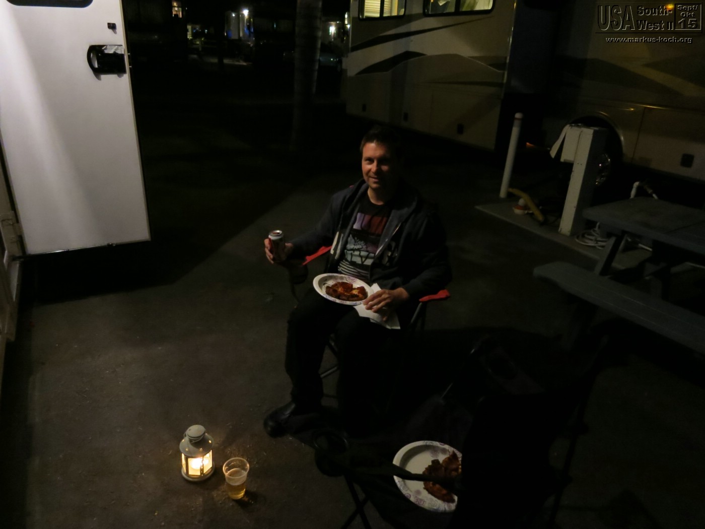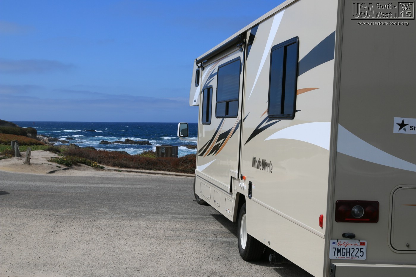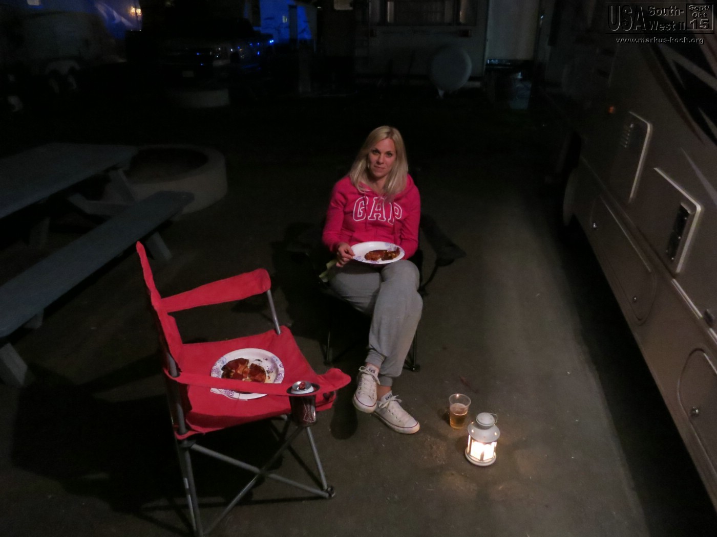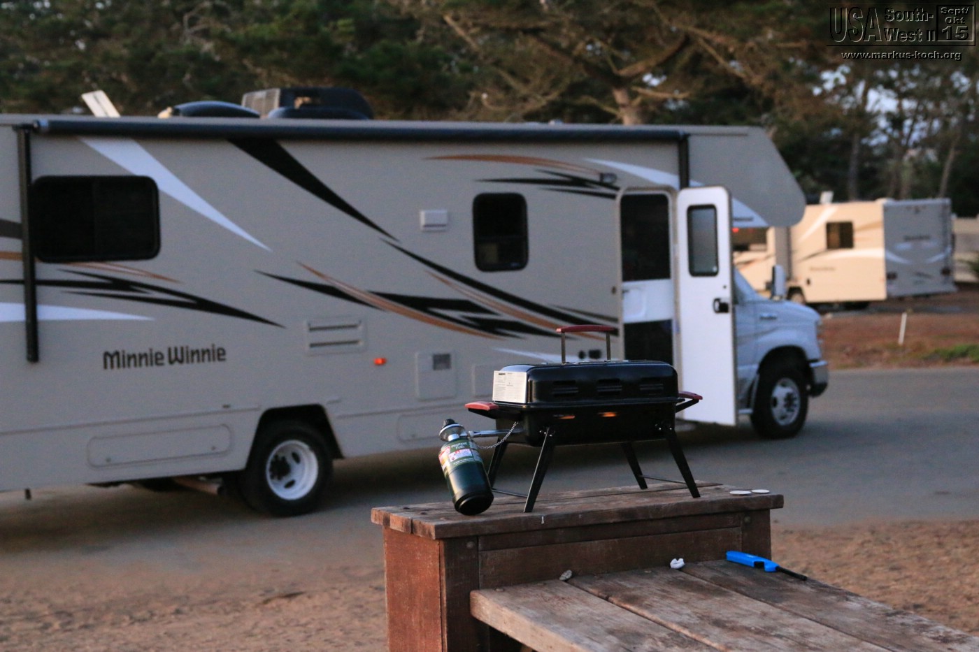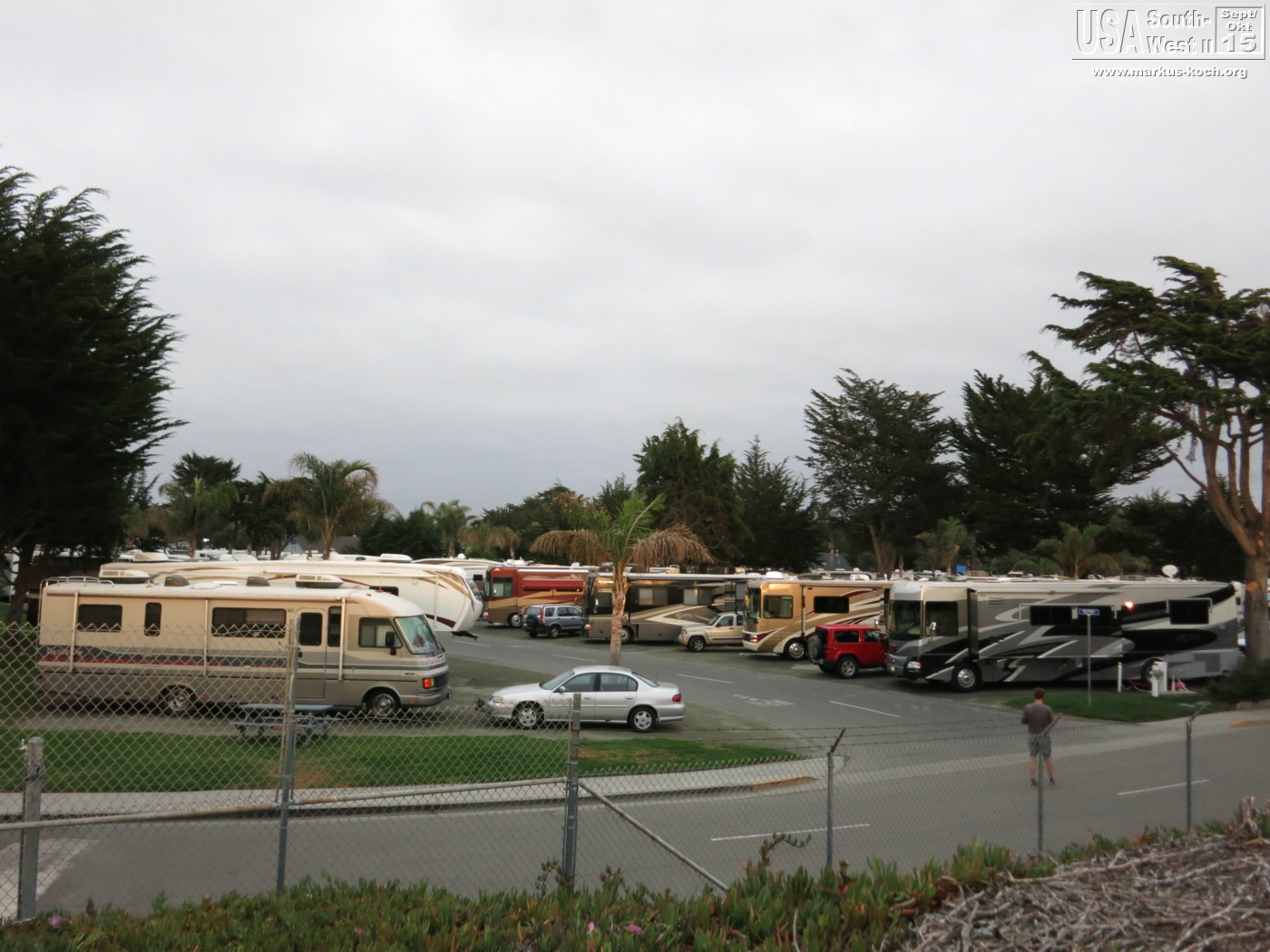 Am Wunsch-Campingplatz angekommen hat uns das Office aber leider abgewiesen, da wir kein Allradantrieb haben. Plan war, dass wir auf einem befahrbaren Strand übernachten wollten, was sicher eines der coolsten Abenteuer geworden wäre. Reservieren konnte man nicht und der Mann aus dem Office schickte uns zu einem anderen CG in der Nähe. Leider war dieser schon ausgebucht und wir wurden wieder weitergeschickt. Am Ende sind wir in Pismo Beach auf einem RV Resort gelandet. Mit Full Hockup – was bedeutet: Strom- und Wasseranschluss, Ablassroher für Black & Grey Water (Kacka & Abwasser). Das hat nun schonmal super geklappt. Jetzt wissen wir, wie das so vor sich geht 🙂