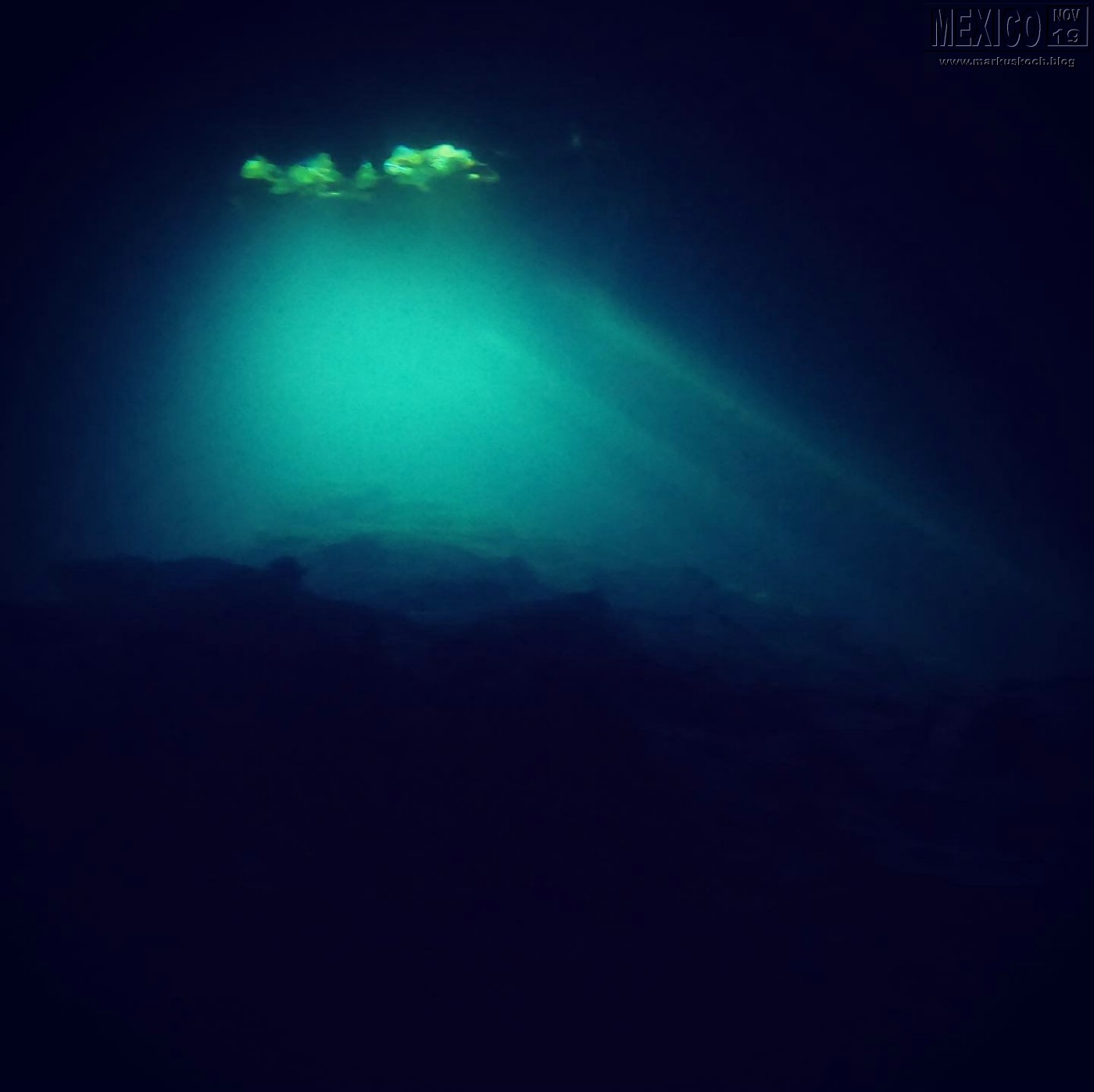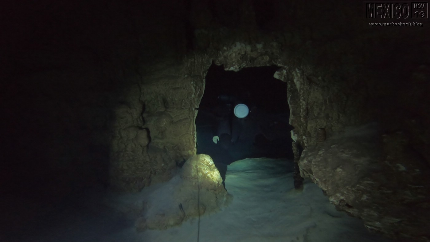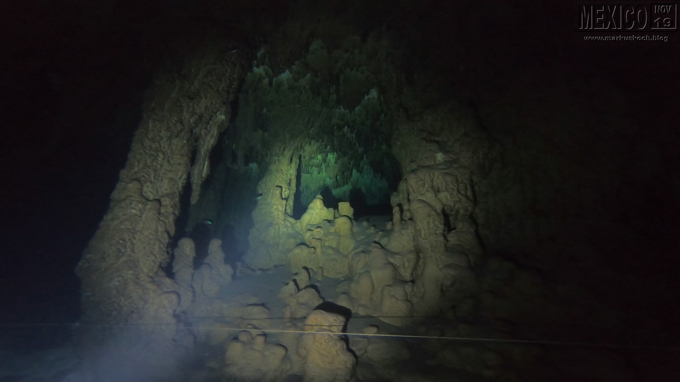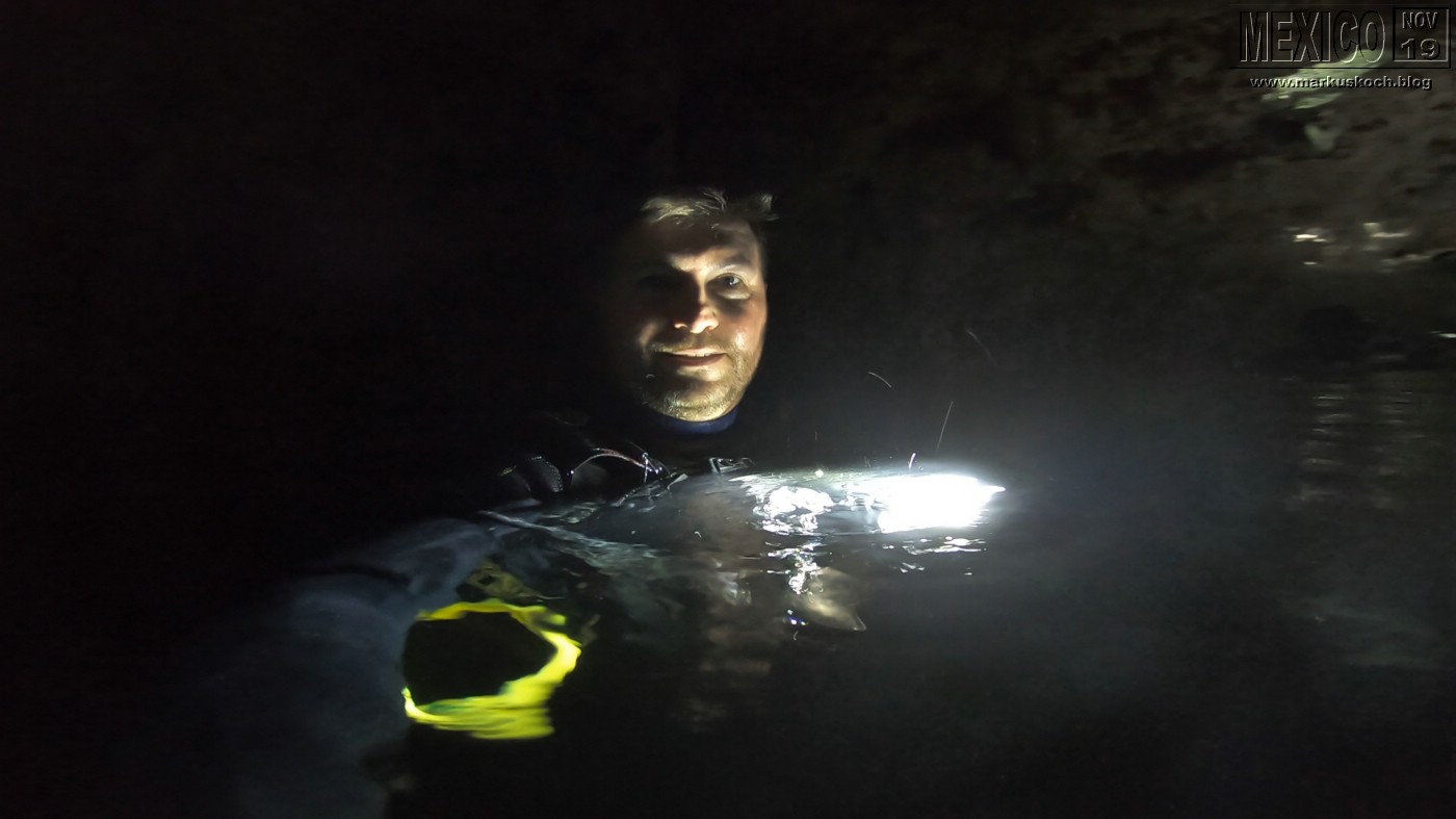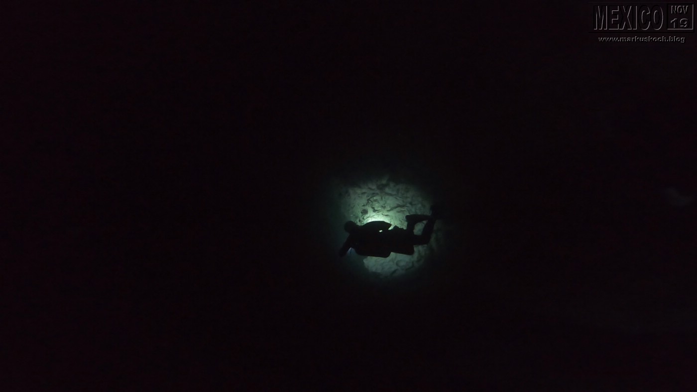 Calavera war insoweit besonders, da fast der ganze Tauchgang in einer Halocline Schicht stattfand. Halocline hatte ich letztes Jahr schonmal erklärt ist eine Schicht zwischen Süß- und Salzwasser in der Cenote. Diese Mischung gibt es recht selten. Man sieht im Übergang nur verschwommen, was recht gewöhnungsbedürftig ist.