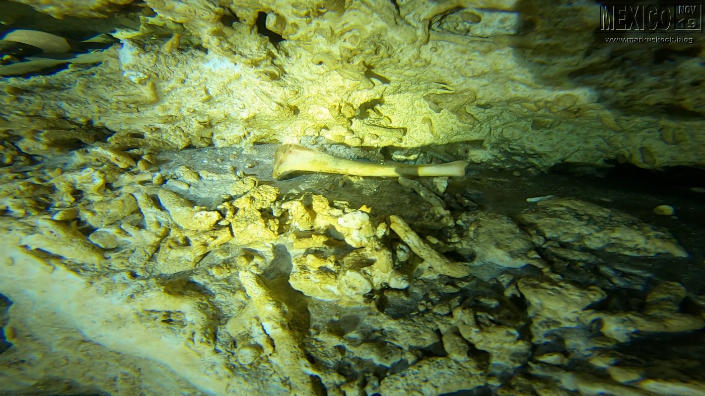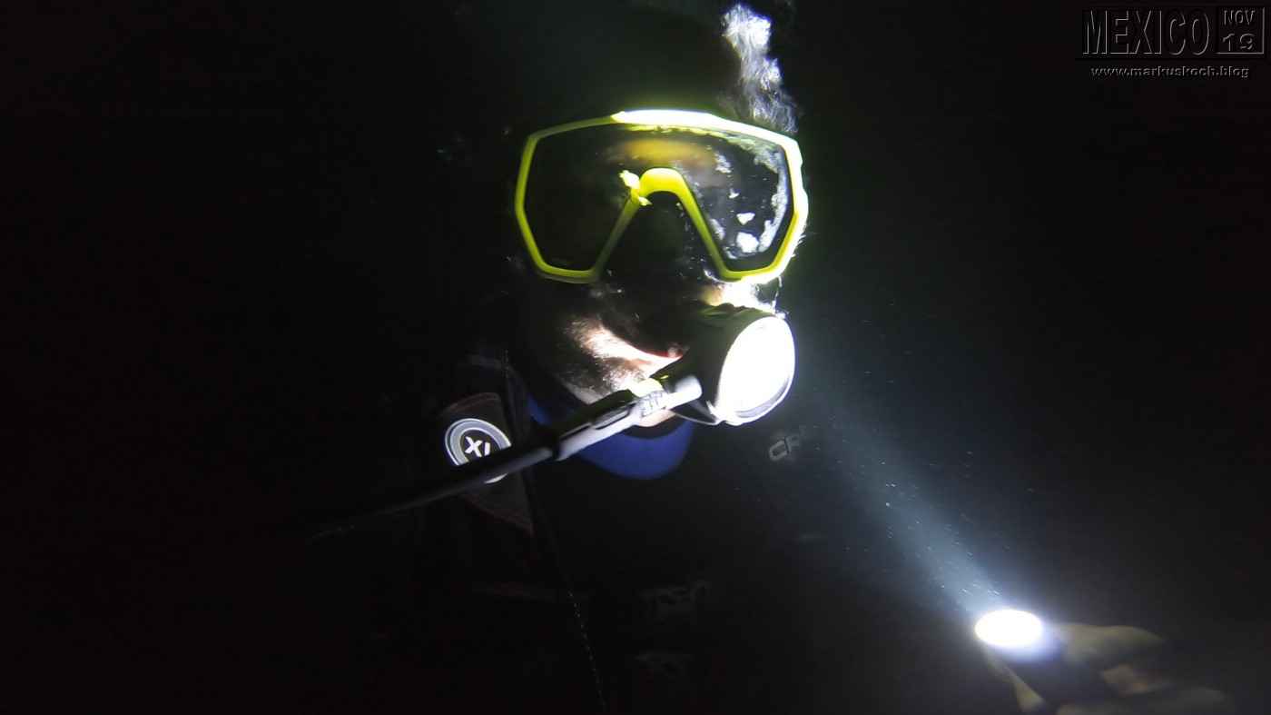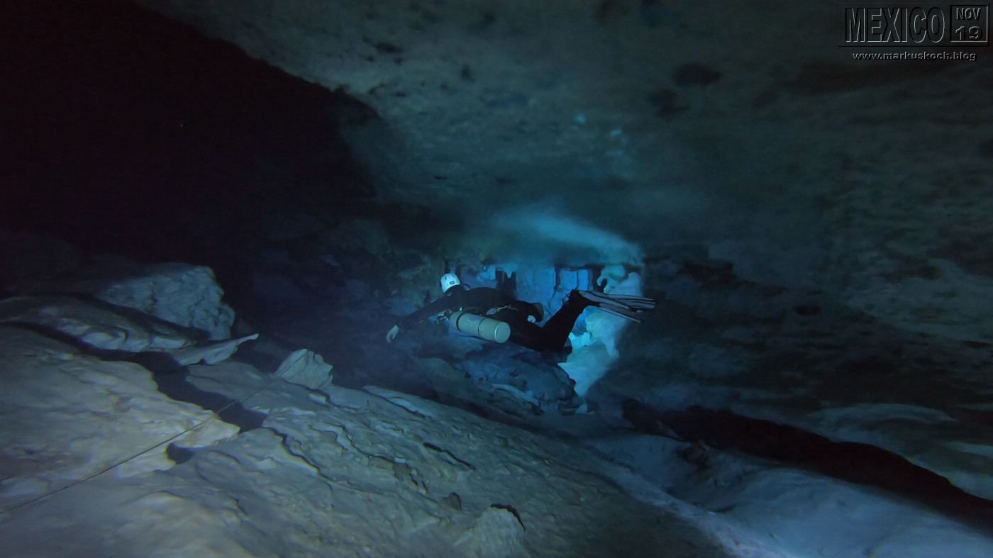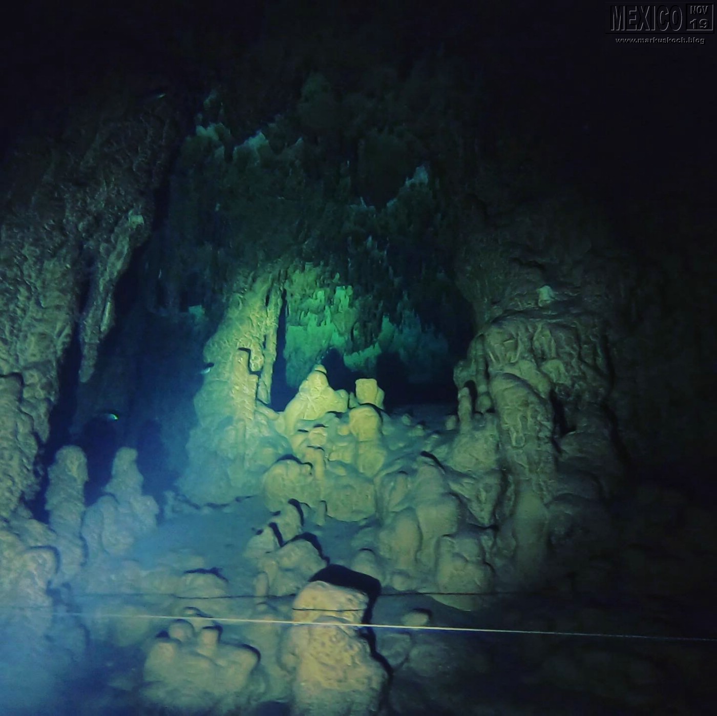Calavera war insoweit besonders, da fast der ganze Tauchgang in einer Halocline Schicht stattfand. Halocline hatte ich letztes Jahr schonmal erklärt ist eine Schicht zwischen Süß- und Salzwasser in der Cenote. Diese Mischung gibt es recht selten. Man sieht im Übergang nur verschwommen, was recht gewöhnungsbedürftig ist.