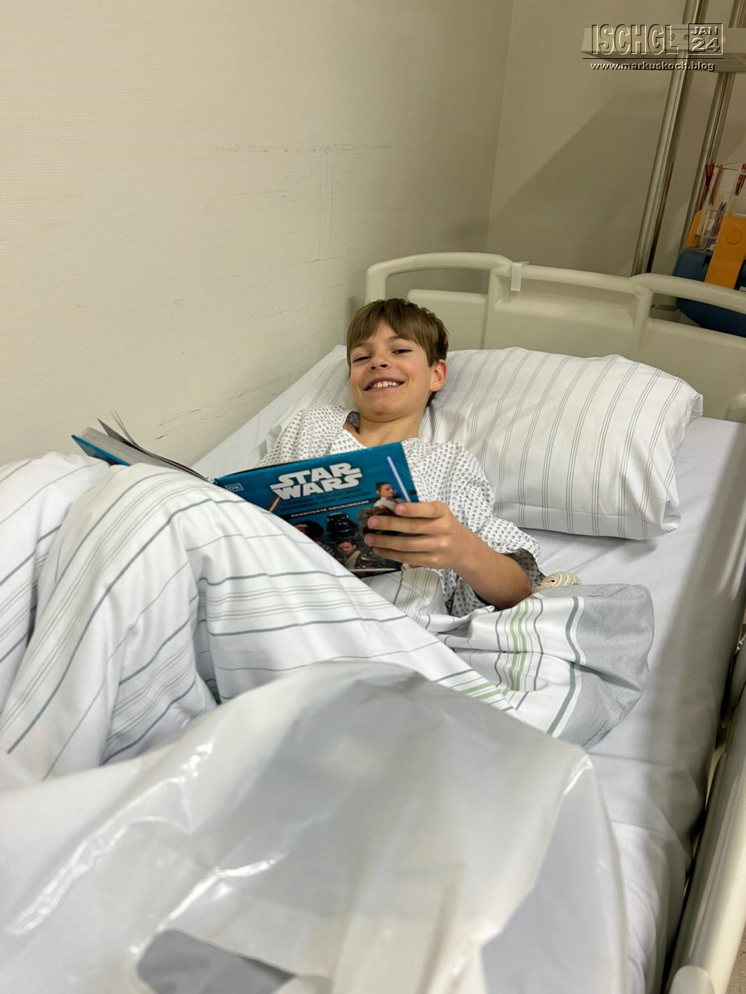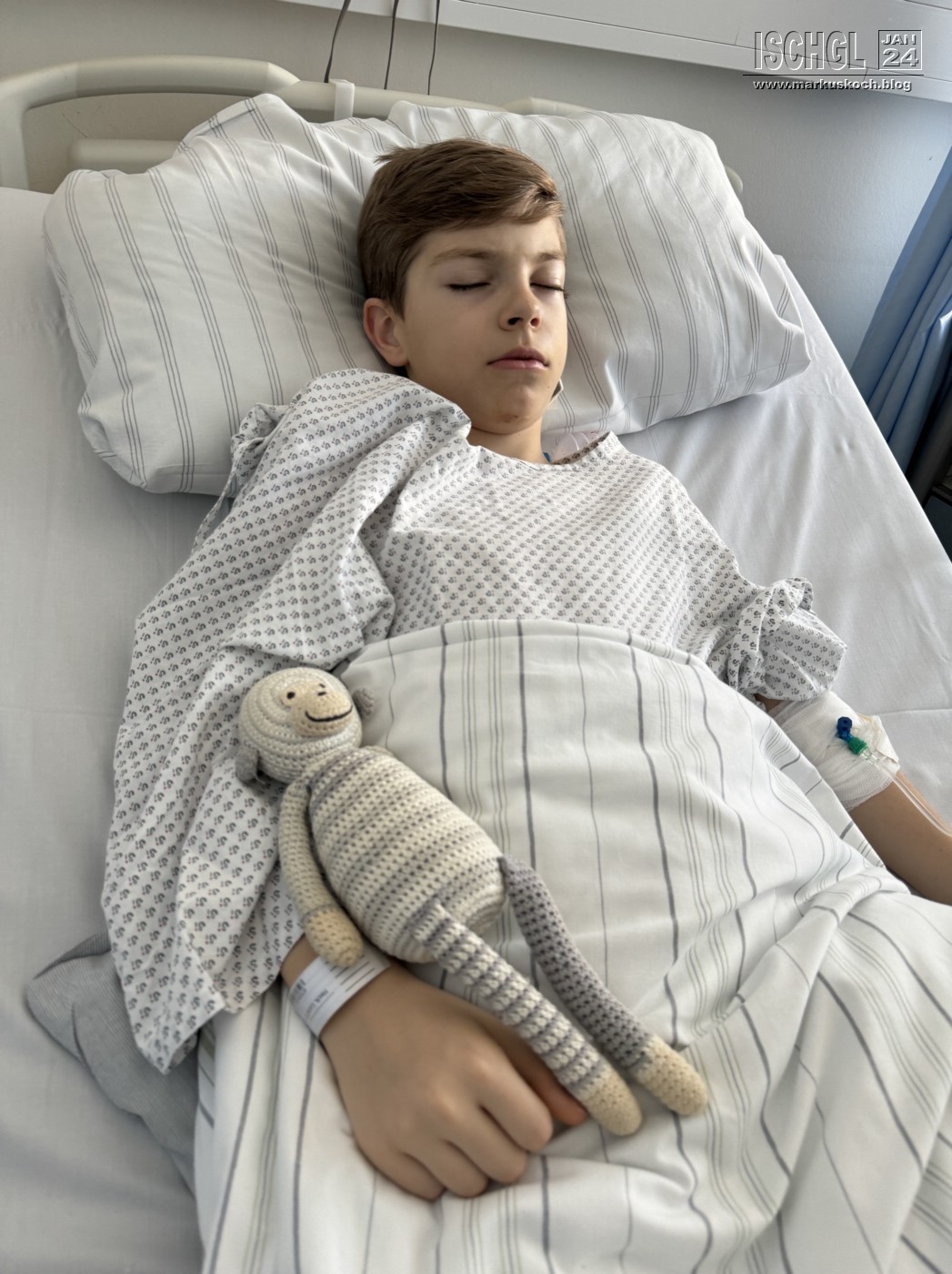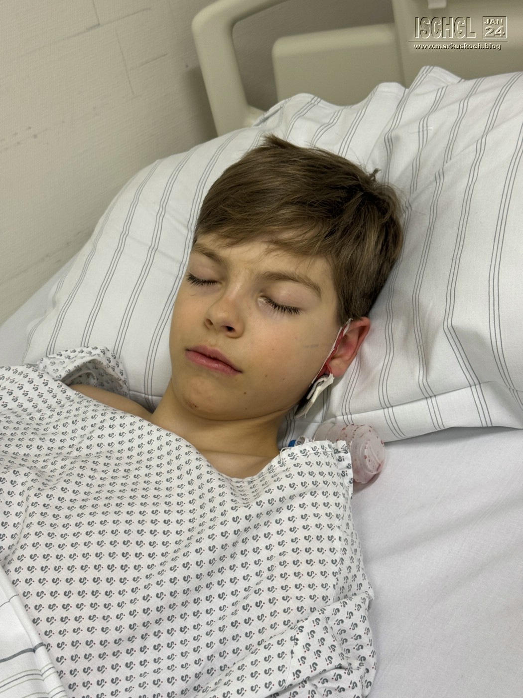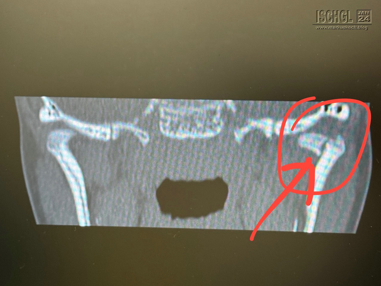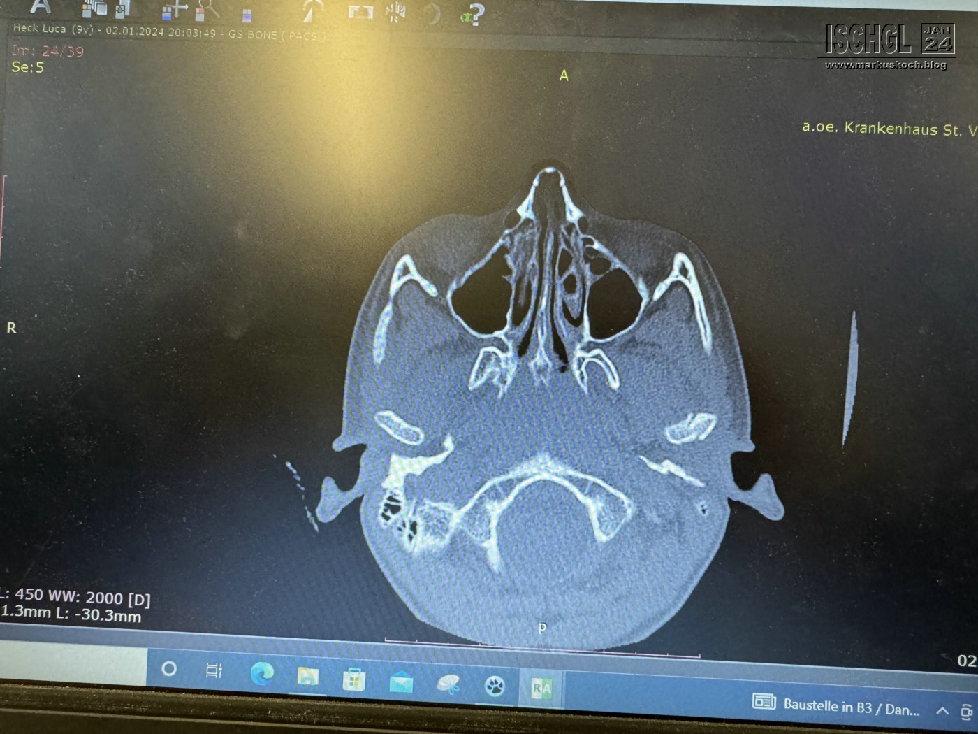 Leider ist Luca auf der Eislauffläche bzw. am nicht präparierten Rand beim Bremsen aufs Kinn gefallen. Anschließend Arzt in Ischgl und weil er nicht so exakt am Kopf röntgen konnte, sollten wir nach Zams ins Krankenhaus. Dort wurde dann genau nachgeschaut und sogar ein CT gemacht. Leider hat sich herausgestellt, dass er sich das Gelenkköpfchen des Unterkiefers gebrochen hat.