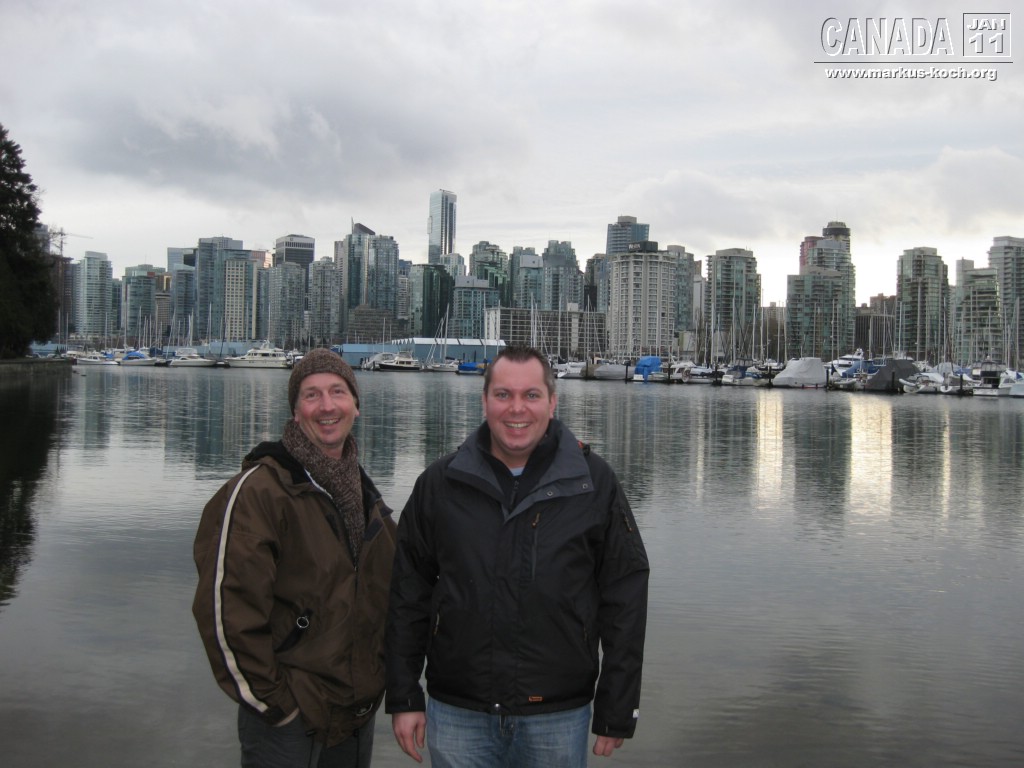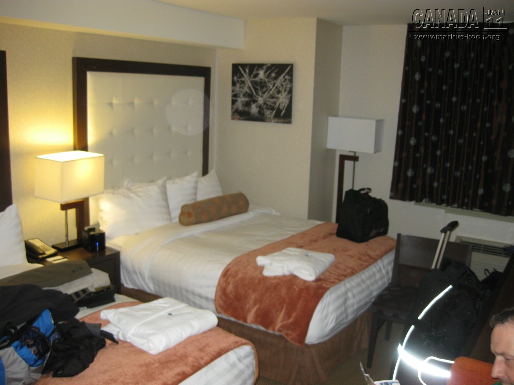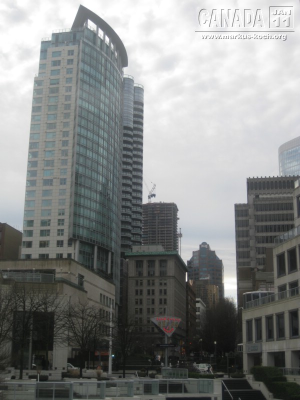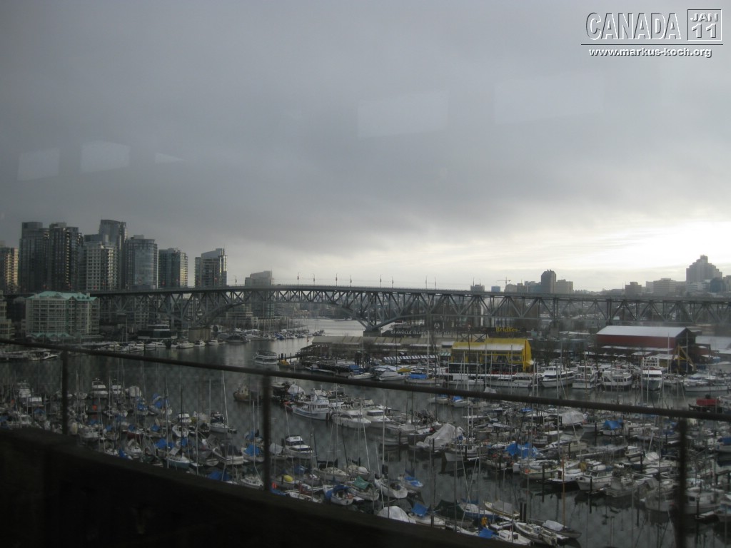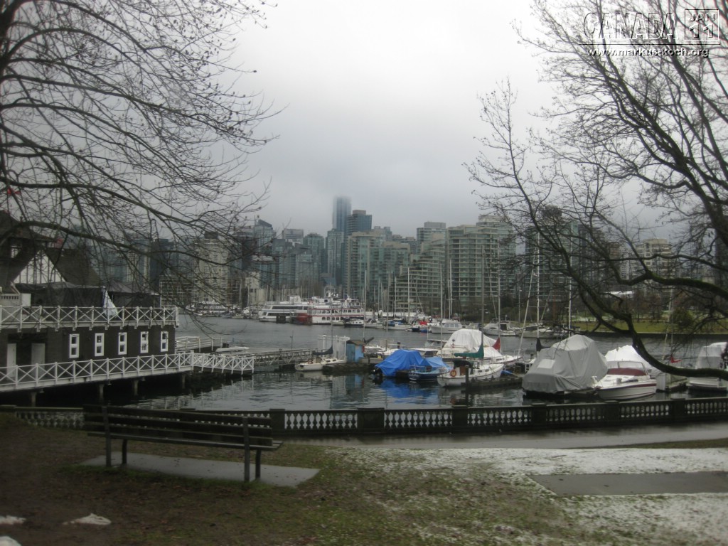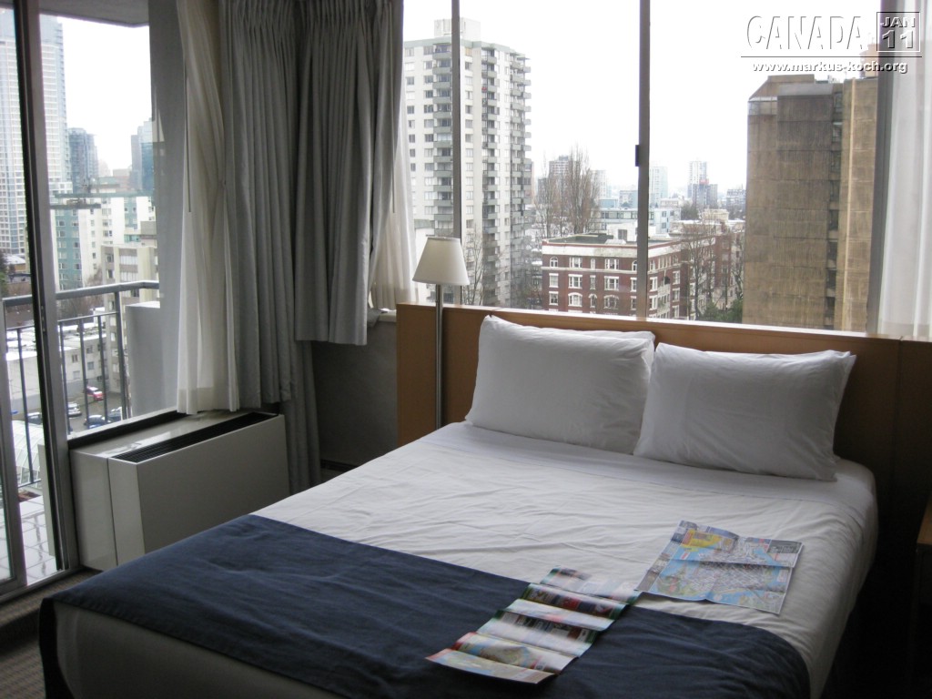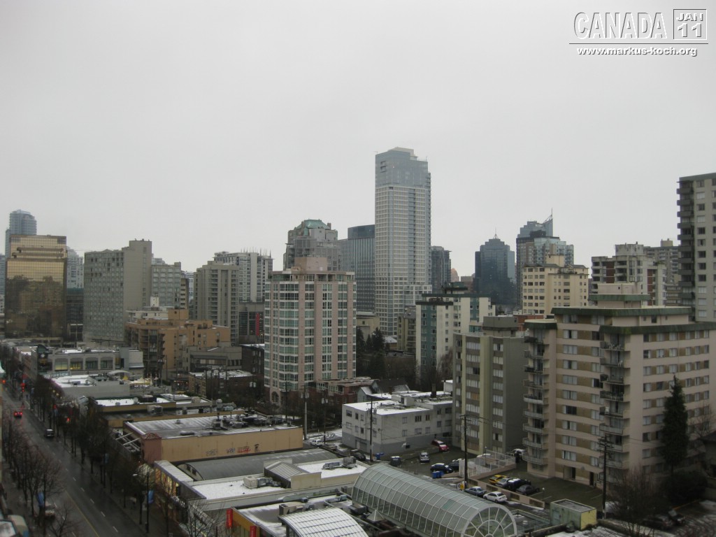 Aufgewacht bei Schneefall in Whistler wurden wir um 7 Uhr von Pacific Coach abgeholt und nach Vancouver gebracht. Dort mussten wir ca. 600 m mit unserem Gepäck zu unserem Hotel Blue Horizon laufen. Auch wenn sich 600 m nicht viel anhört, es war mit dem ganzen Gepäck eine ganz schöne Strecke, vor allem auch für Udo, der leider immer noch Probleme mit seinem Unterschenkel hatte.