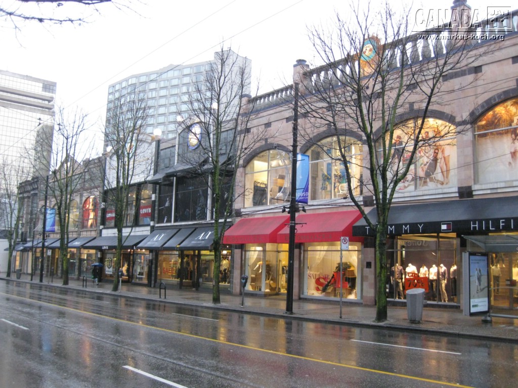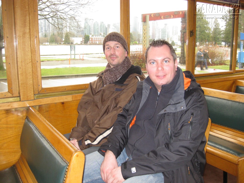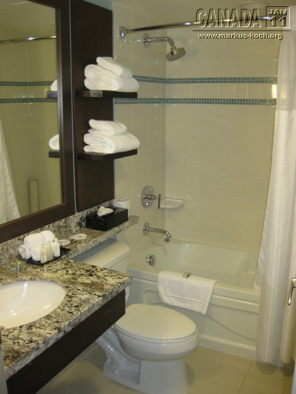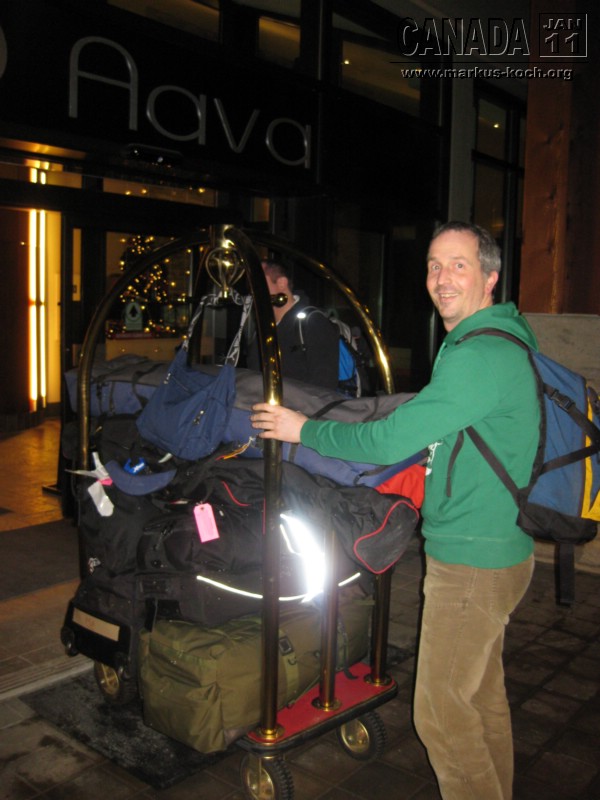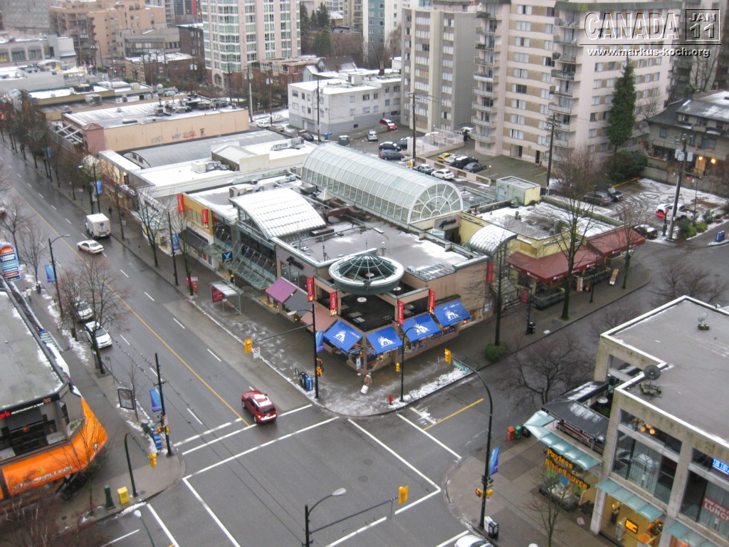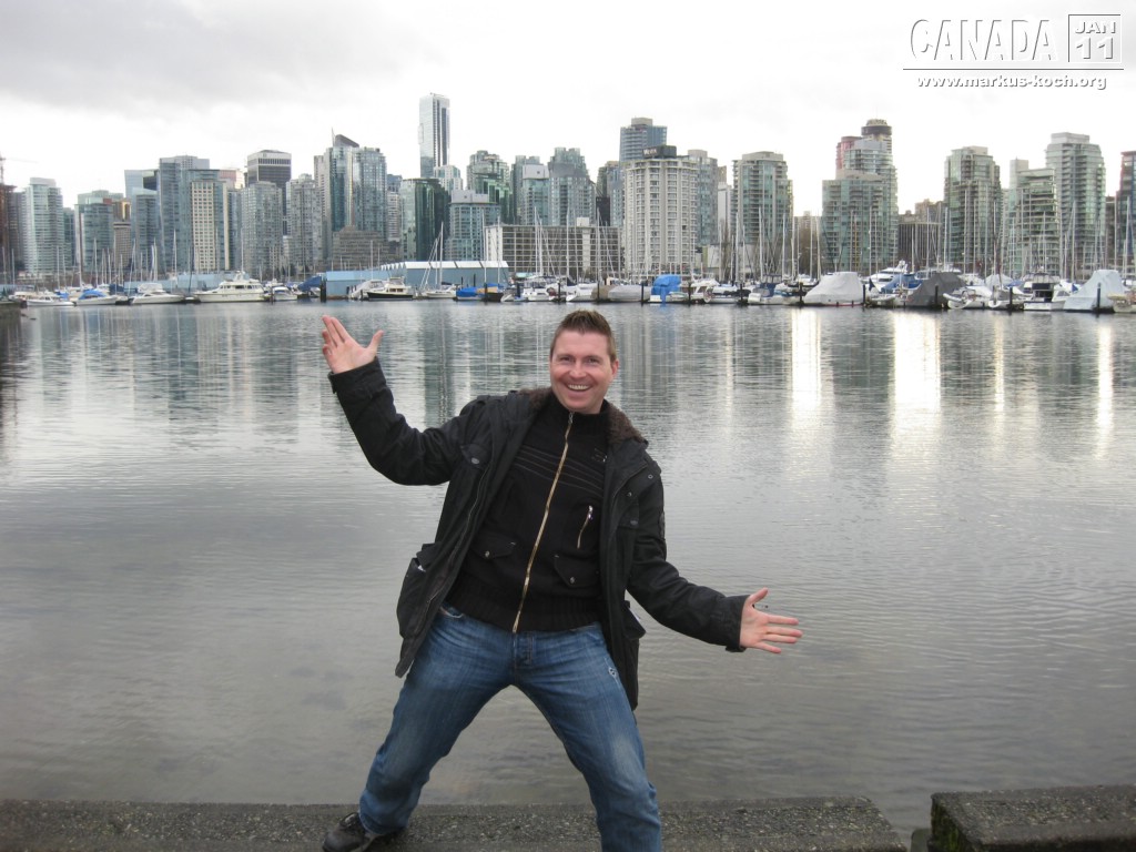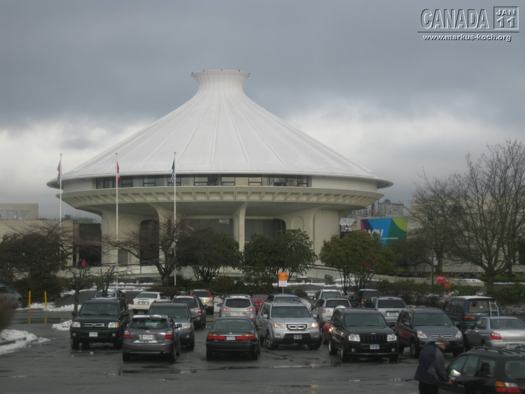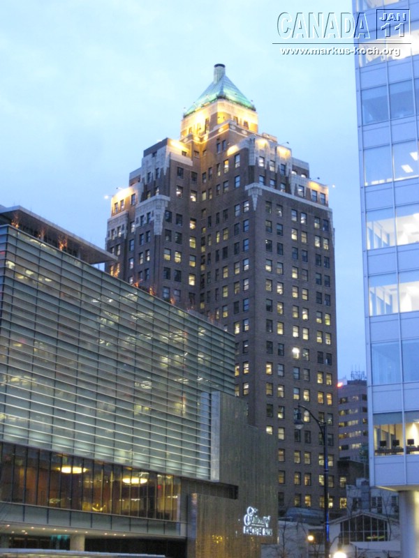 Aufgewacht bei Schneefall in Whistler wurden wir um 7 Uhr von Pacific Coach abgeholt und nach Vancouver gebracht. Dort mussten wir ca. 600 m mit unserem Gepäck zu unserem Hotel Blue Horizon laufen. Auch wenn sich 600 m nicht viel anhört, es war mit dem ganzen Gepäck eine ganz schöne Strecke, vor allem auch für Udo, der leider immer noch Probleme mit seinem Unterschenkel hatte.