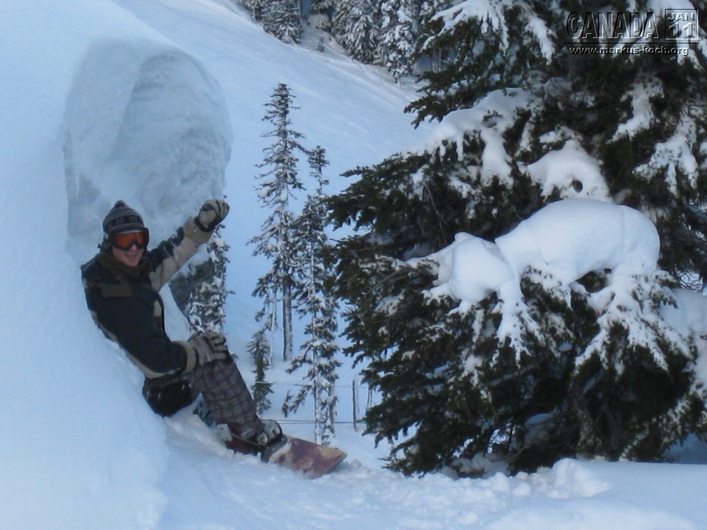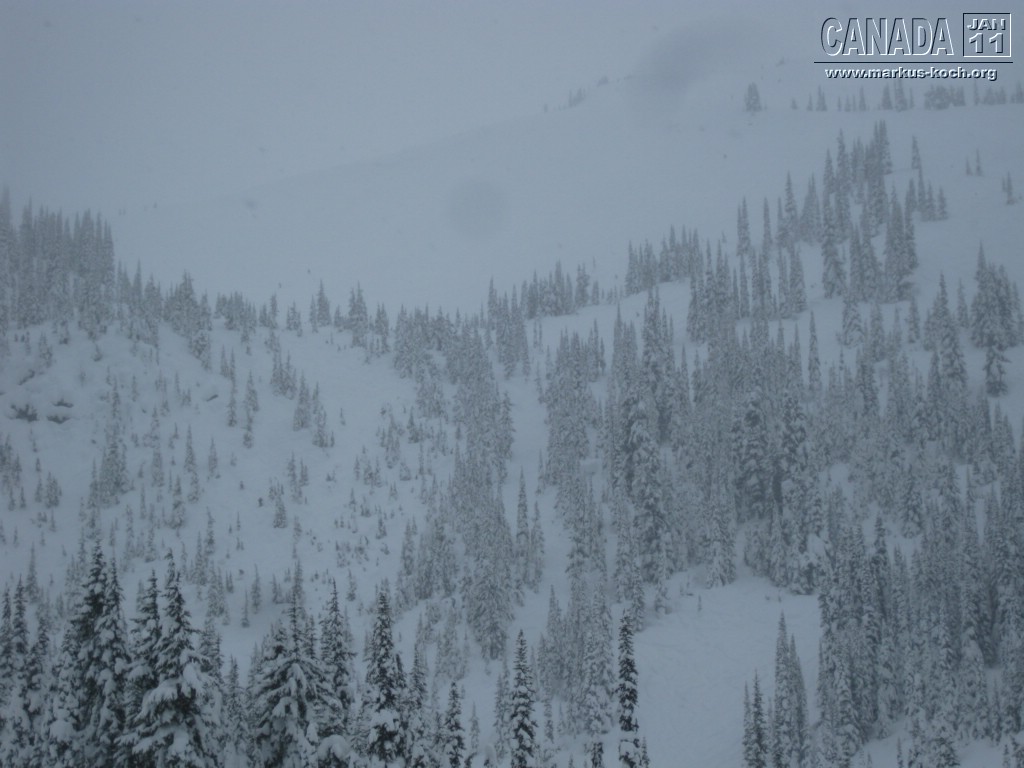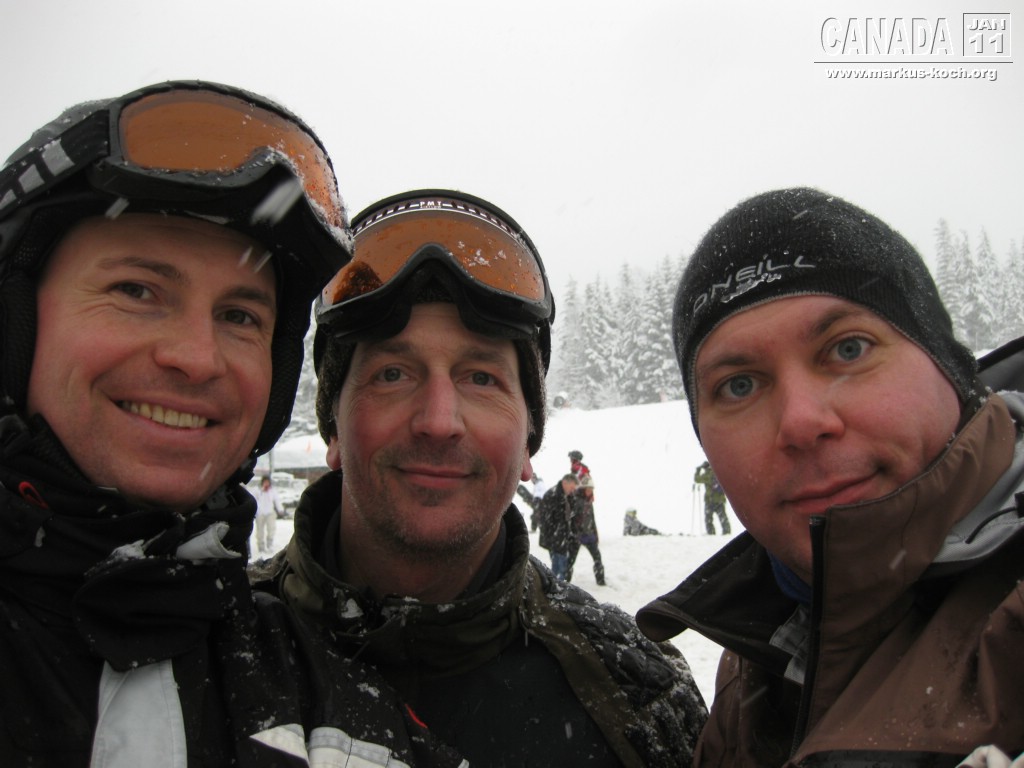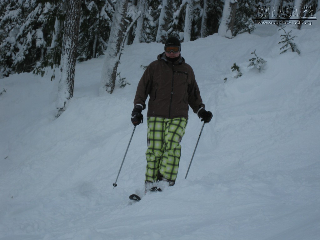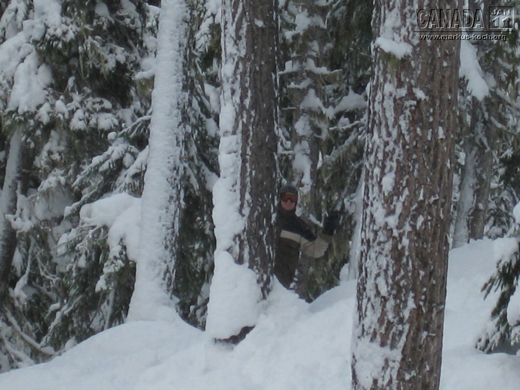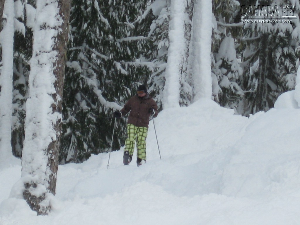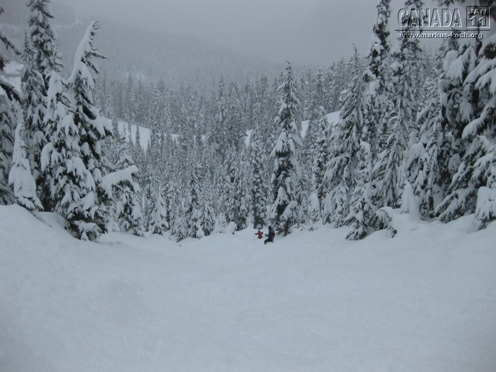 Heute am 5.1. sind wir mit Schneefall aufgewacht. Im Laufe des Tages hat es im Dorf sicher 10-15 cm Neuschnee gegeben. Uns Jungs hat das keineswegs aufgehalten den Blackcomb-Mountain mit Skieer zur erkunden. Auf einer Teilstrecke haben wir den Neuschnee-Hang zu entjunfern – war echt geiler Schnee, wie auf Puderzucker konnten wir den Berg hinabgleiten 🙂 Genial war eine schwarze Abfahrt durch den Wald!