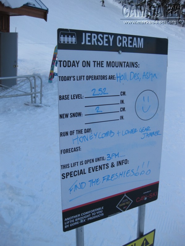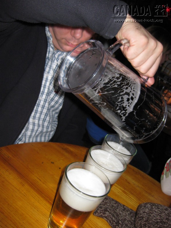 Aufgewacht bei Schneefall ging es zur Liftstation. Wir überlegten, ob wir Skifahren sollen oder den Tag frei machen sollen, da wir ja 6 von 7 Tagen Skipass haben. Da aber ich ein Tag Catskiing machen werde (wahrscheinlich am Mo, 10.1.), bin ich hochgefahren, um das Wetter & Schnee zu testen. Wieder unten angekommen haben die beiden Jungs dann beschlossen eine Runde in Whistler Village shoppen zu gehen, während ich den Tag am Whistler Mountain in über 15 cm Neuschnee verbrachte. War trotz dem Wetter echt gut! Später trafen wir uns in der Longhornbar, wo wir eigentlich jeden Tag unseren Apres-Ski mit Pitcher of Longhorn Lager Beer (20$) genießen. Der Apres Ski hier in Whistler ist jedoch nicht mit den in den Alpen zu vergleichen. Ich finde in den Alpen ist es etwas mehr Feierei 😉