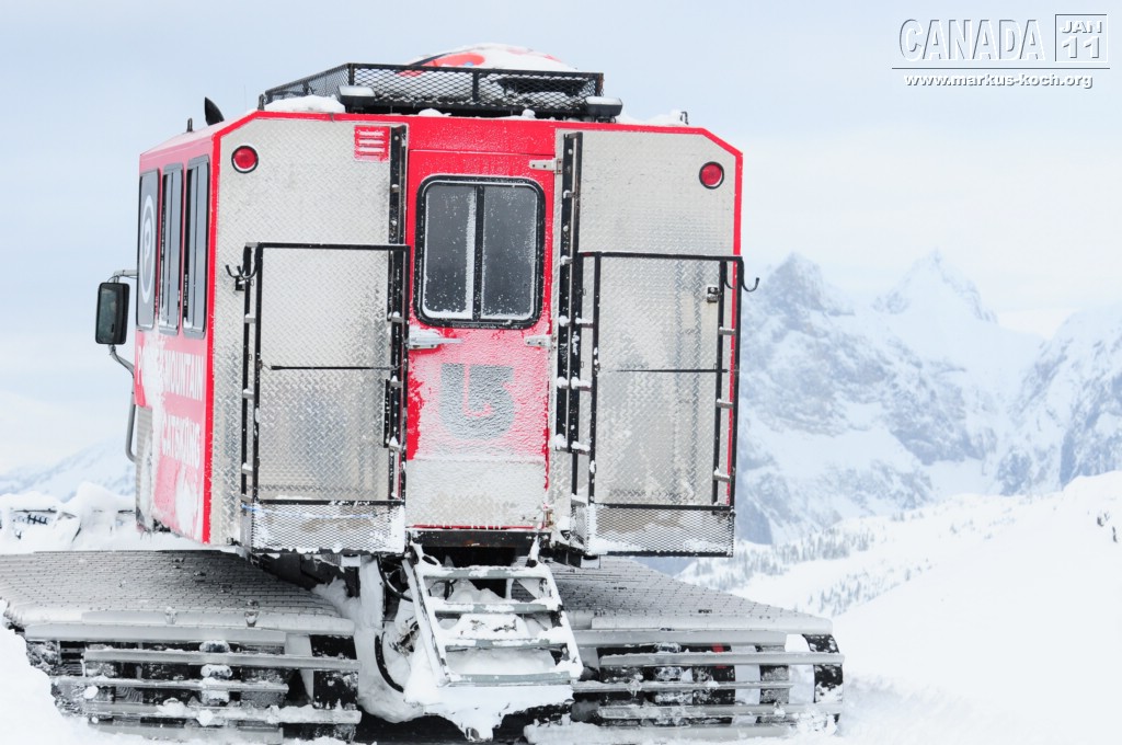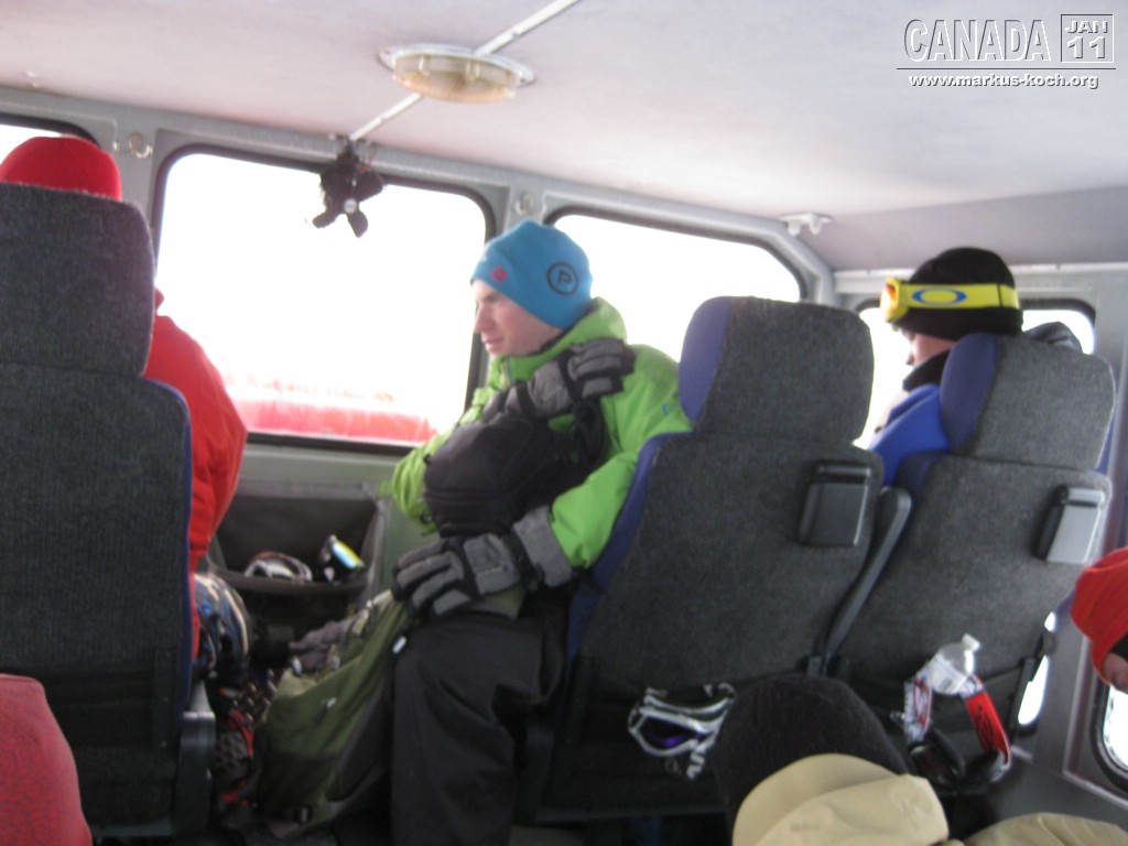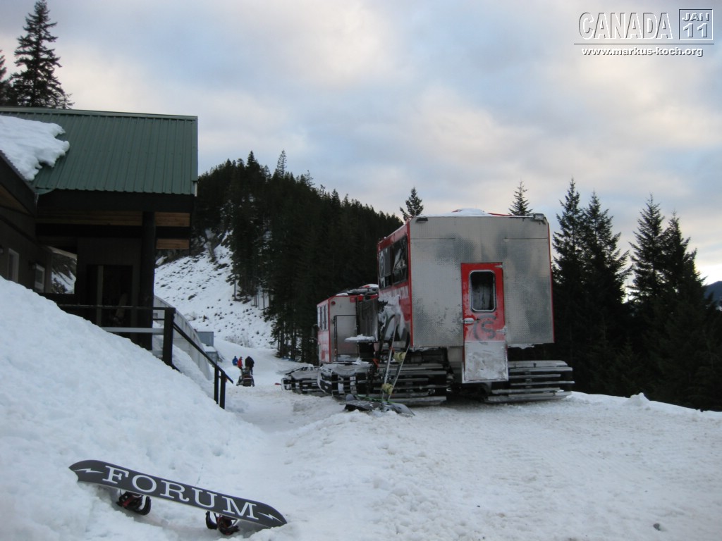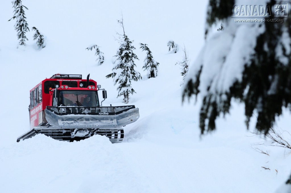 Morgens bin ich in einem Bus von Whistler in ein abgelegenes Gebiet gefahren. Dort war die Basisstation zum Catskiing. Weiter ging es mit dem Cat auf einem Berg, wo wir den ganzen Tag unterwegs waren. Während der ersten Auffahrt wurden uns die Lawinenpiepser erklärt, die es vor der ersten Abfahrt auch auszuprobieren galt.