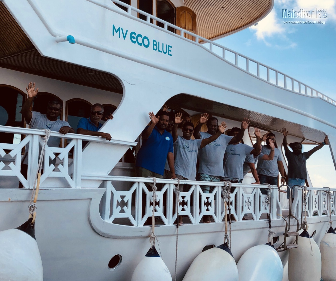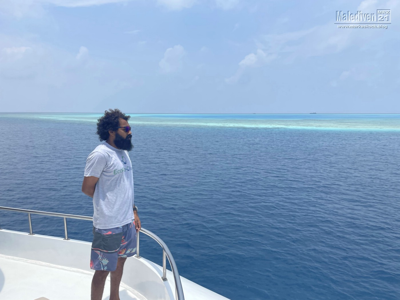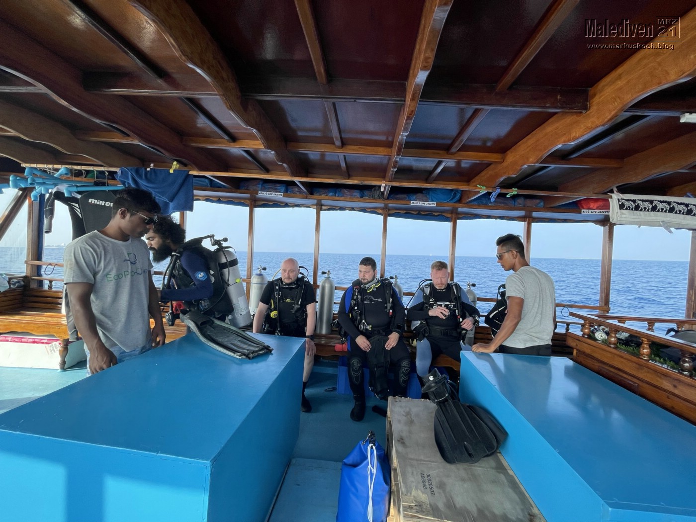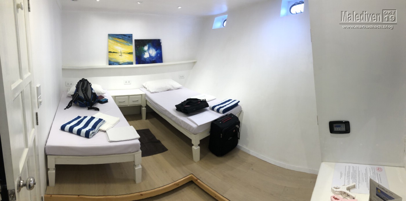 Am Flughafen angekommen wurden wir von einen der Tauchguides Florian empfangen, der uns zu weitern Gästen brachte. Nachdem der erste Schwung vollständig war, schipperten wir mit dem Tauchboot zur Eco Blue.
