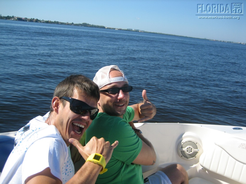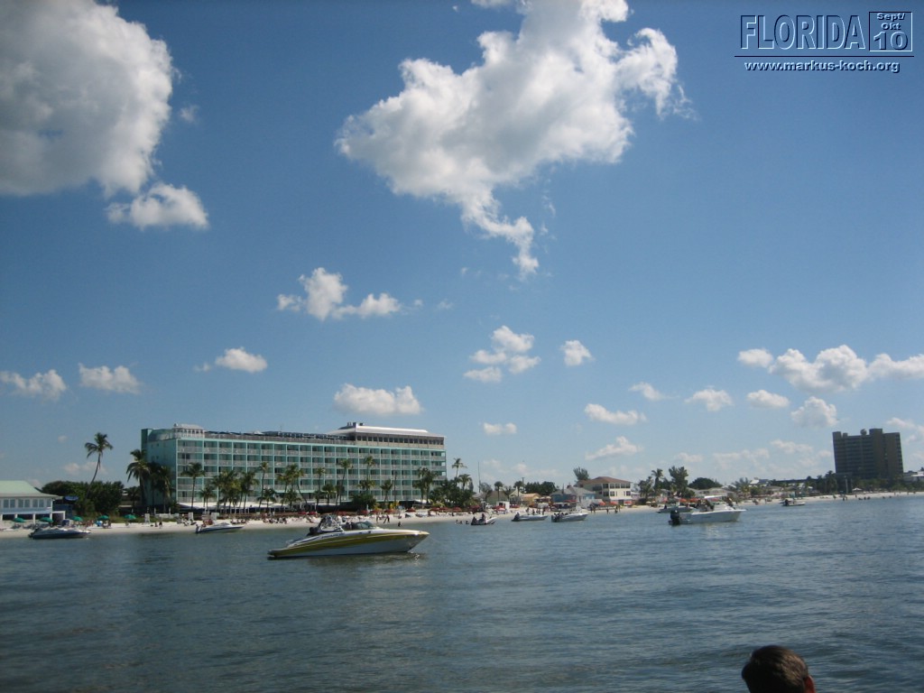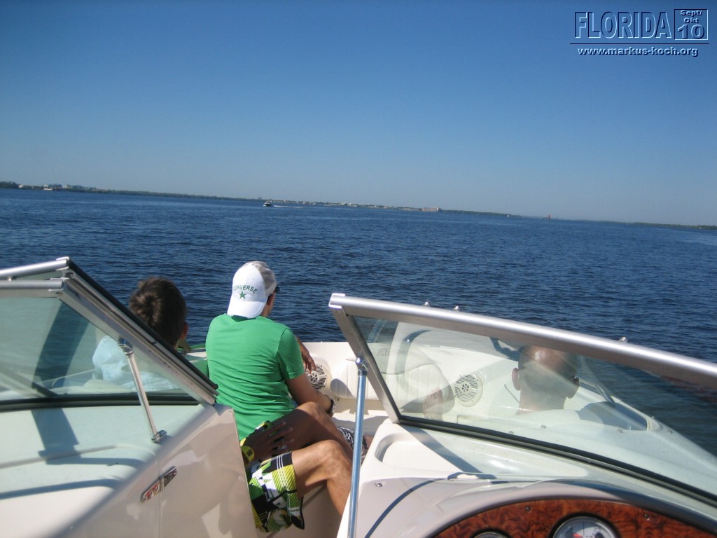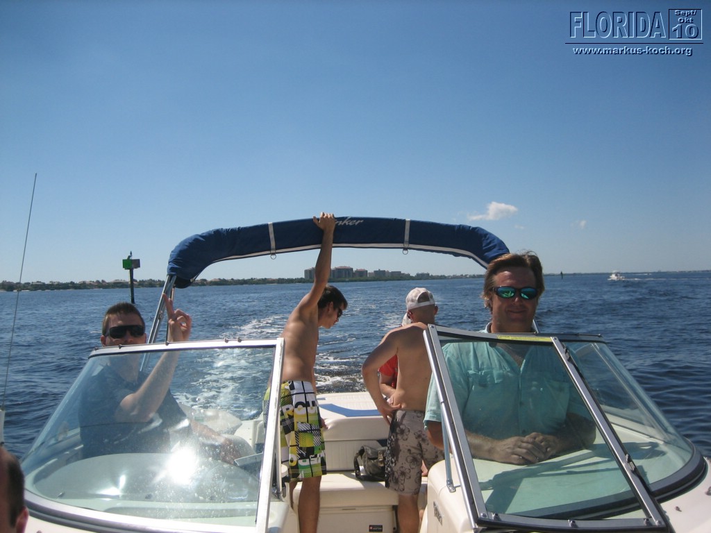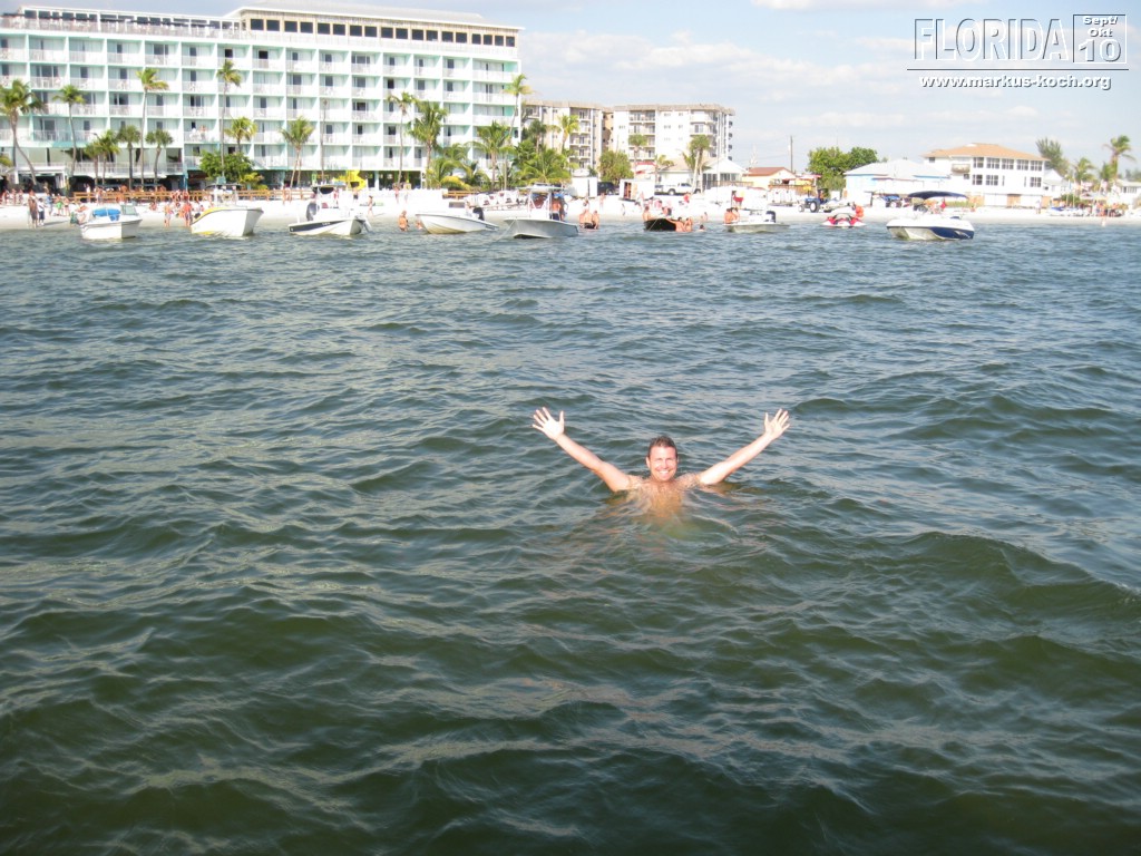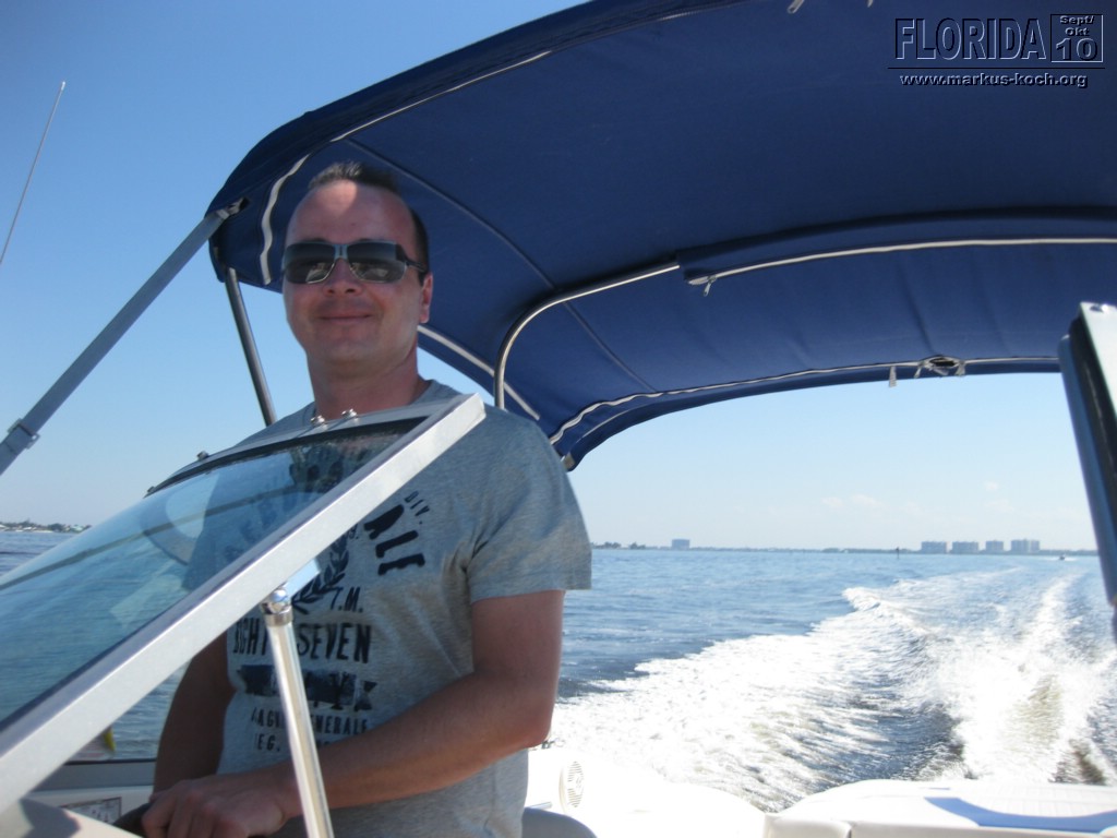 Da der Nachmittag trotzdem noch jung war, überlegten wir uns noch eine kleine Runde mit dem Boot nach Fort Myers Beach zu cruisen. Sevgi & Nico haben das Steuer übernommen. Max, Alex, Irul und ich waren ihnen natürlich behilflich. An Fort Myers Beach angelangt beschallte uns die Musik der Kneipen vom Strand. War nicht schlecht da, aber wir fuhren wieder zurück. Ich sprang nur kurz ins Wasser für eine Abkühlung 🙂