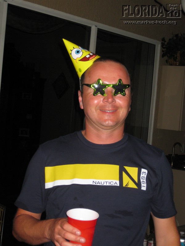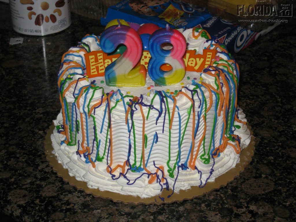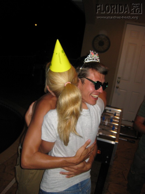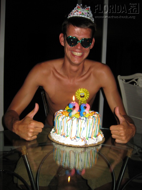 Kaum war das Abendessen rum und 10 neue Runden UNO hinter uns, schon konnten wir in MAX seinen Geburtstag rein feiern – ganz typisch amerikanisch. Rote Plastikbecher, Hütchen auf’m Kopf, Sternchensonnenbrillen & Co und die Prinzessinkrone für Max und die Eistorte mit der 28 drauf 🙂